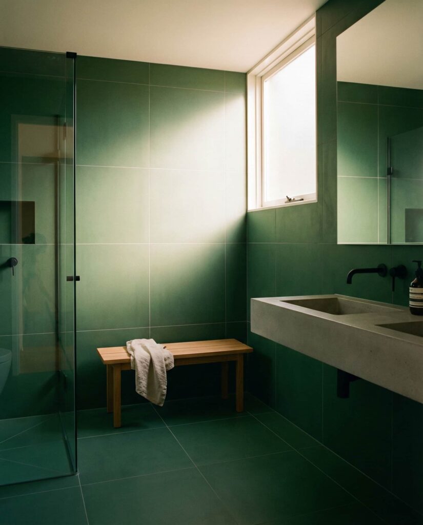 Forest green tiles bring a grounding, organic presence into the bathroom. Often used in large formats to reduce visual clutter, this look pairs beautifully with stone sinks and wood cabinetry. Designers at Dezeen frequently reference nature-inspired palettes as a response to digital overload. A simple shower designs approach, such as a tiled alcove, keeps the focus on material quality. Personally, forest green bathrooms remind me of boutique hotels that feel calm without trying too hard.