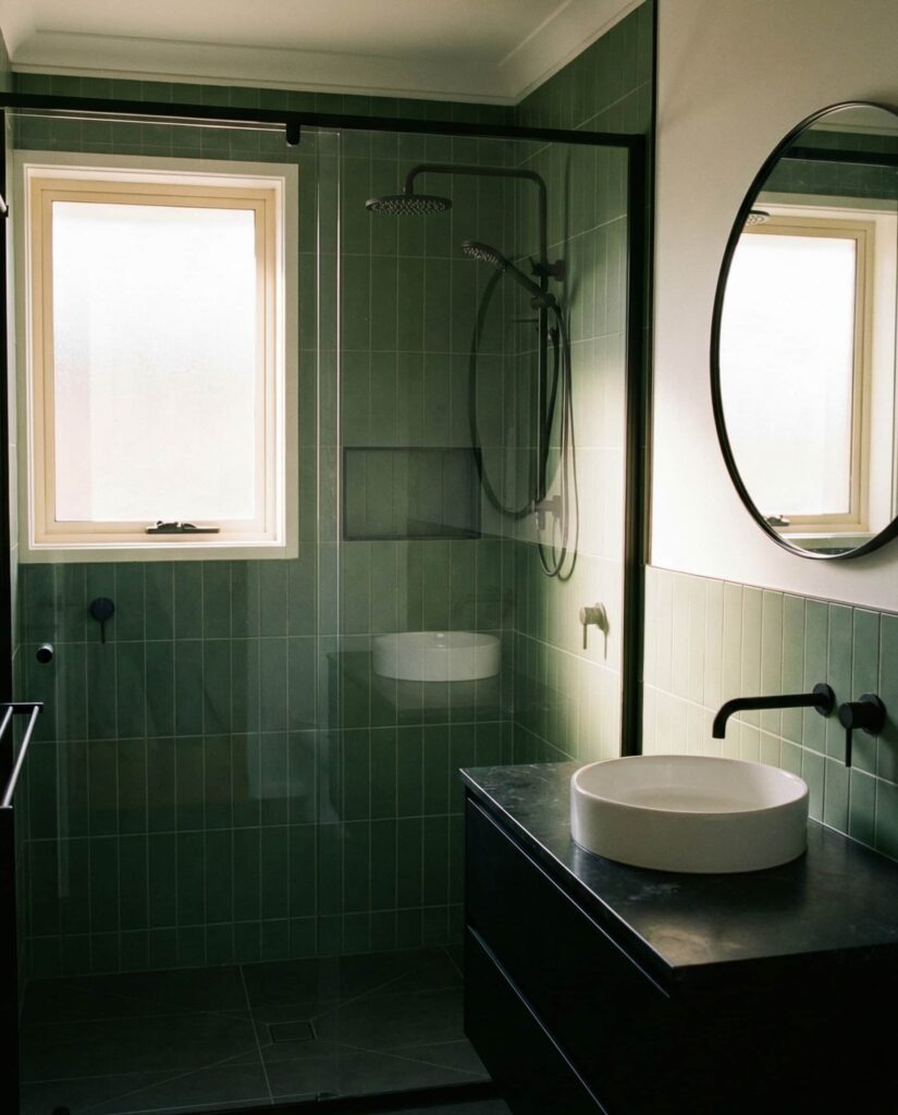 Green tiles paired with black fixtures create a crisp, graphic look that feels current but not trendy. This combination works across many shades, from pale green to deep emerald. Designers often recommend matte black finishes to avoid glare and fingerprints. In my experience, this contrast photographs beautifully and gives bathrooms a polished, intentional feel without added decoration.