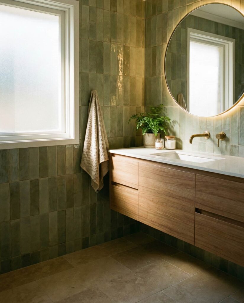 This design centers on extending green tile beyond the wet zone to create a continuous backsplash that wraps the vanity and sink wall, making the bathroom feel cohesive and intentional. Using sage, olive, or jade tones keeps the look grounded, while a neutral floor and restrained paint color prevent visual overload. Designers often recommend this approach for medium-sized bathrooms where a full tile room might feel heavy, but a partial installation still delivers impact. I’ve seen this idea work beautifully in real homes because it protects high-use areas while quietly elevating everyday routines into something more considered.