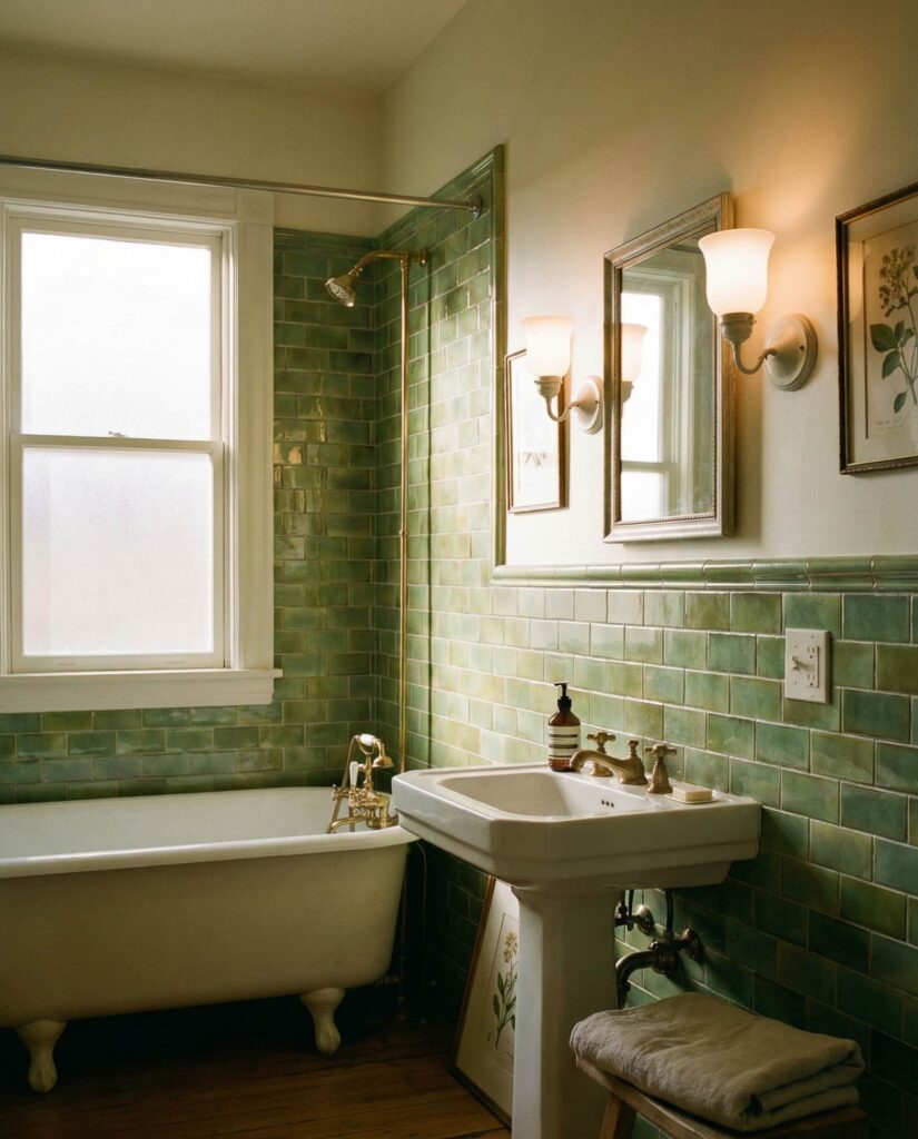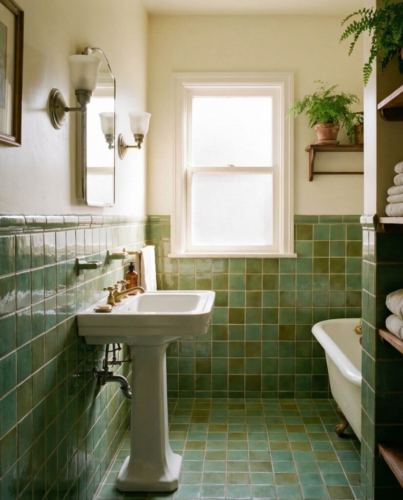 A vintage green tile bathroom doesn’t mean copying the past exactly; it means borrowing its confidence. Think glossy tiles in jade or muted olive, paired with rounded edges and classic fixtures. This retro approach works well in older homes where preserving character matters. Design writers at Remodelista often point out that original tile layouts can inspire respectful updates rather than full replacements. Adding a pedestal sink or traditional wall sconces keeps the space grounded. I’ve always admired how vintage bathrooms feel collected over time, as if the house itself remembers who lived there before.