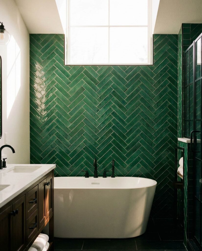 Emerald green tiles are for homeowners who want the bathroom to feel expressive and bold. Used on a feature wall or around a soaking tub, this saturated tone pairs well with black fixtures and warm brass accents. While some fear it may overpower a space, experienced designers often balance it with white and neutral surfaces to keep it grounded. I’ve seen emerald bathrooms steal the show in otherwise simple homes, becoming the room guests remember most. It’s a confident choice that rewards commitment.
