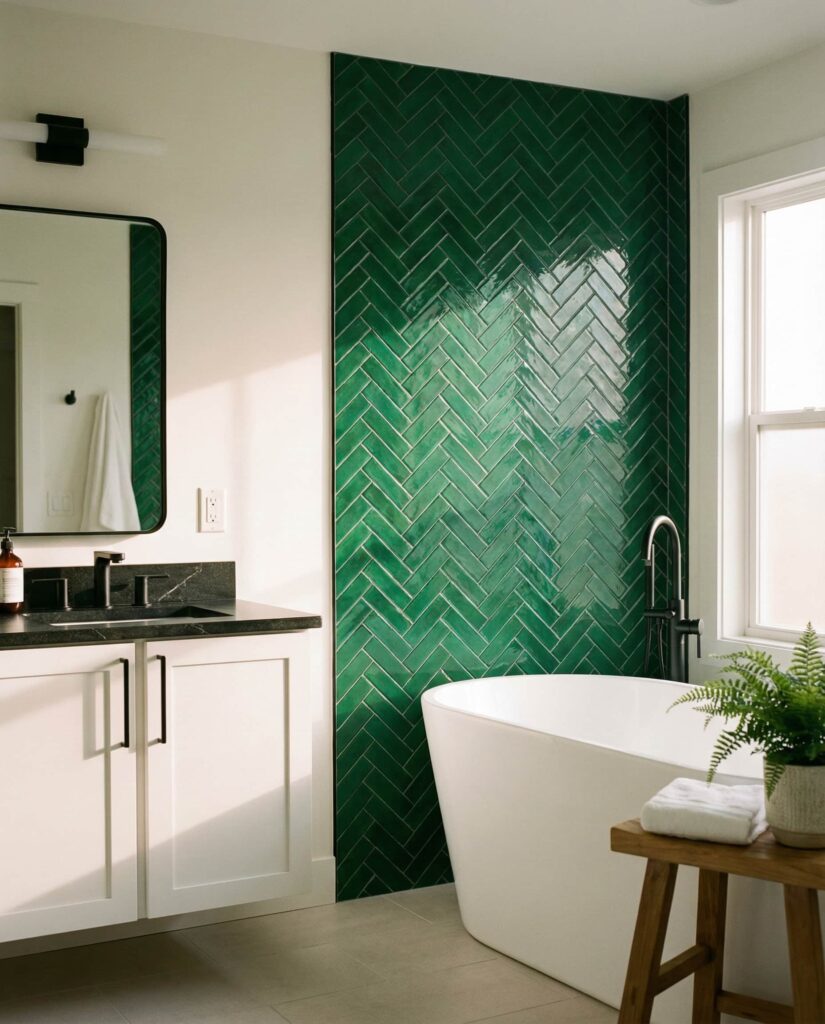 Jade green tiles shine when balanced white and soft neutrals. This approach keeps the space feeling bright while still offering color depth. It’s especially effective in bathrooms with limited natural light, where reflective tile surfaces matter. Designers often recommend jade for homeowners who want color without going fully bold. Pairing it with a simple bathtub surround and light floor materials keeps the look timeless. In my experience, jade feels like a long-term choice rather than a trend.