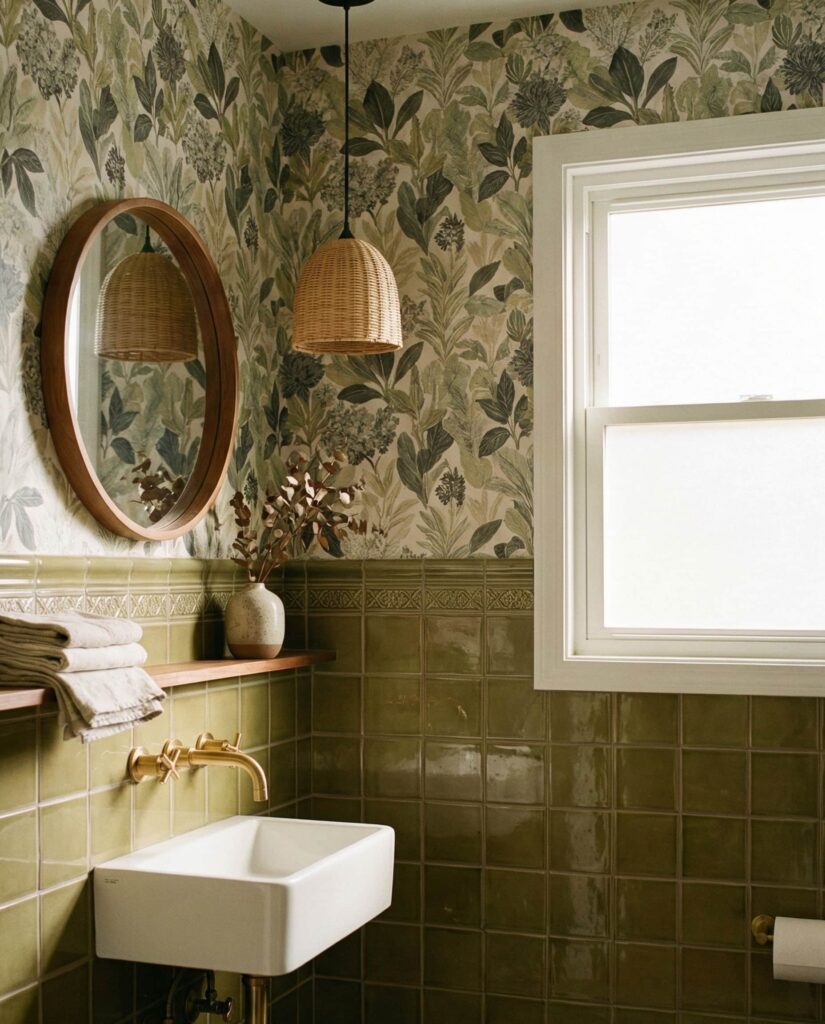 Olive green tiles paired with wallpaper create a layered, editorial look that feels current but livable. This is one of those ideas where contrast matters, especially when wallpaper appears above tile height to protect high-use areas. Many designers recommend botanical or abstract patterns that echo the tile tone without matching exactly. Adding a subtle backsplash detail behind the sink ties the elements together. I’ve seen this approach work surprisingly well in powder rooms where personality matters more than storage.