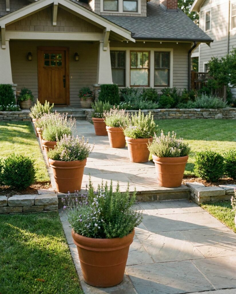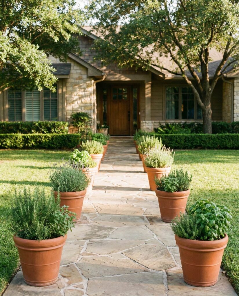 13. Outdoor Potted Herb Line for Front Yard Paths