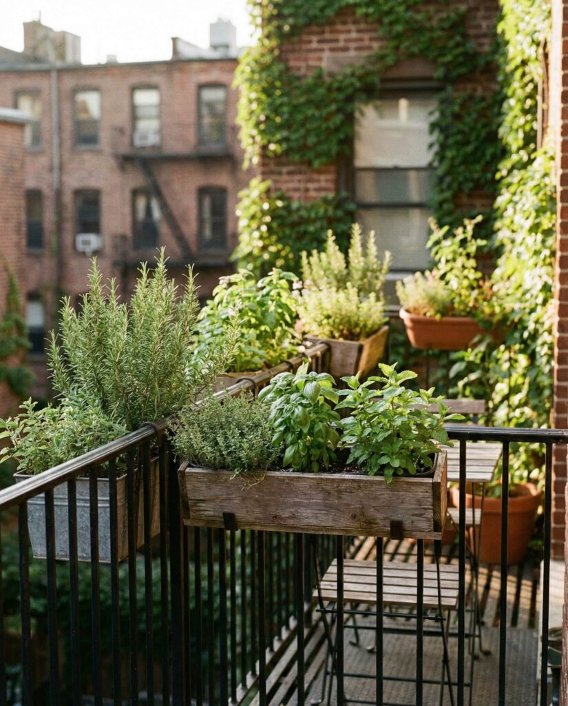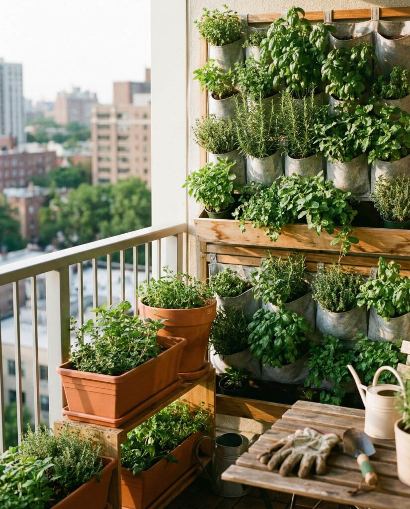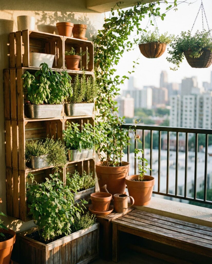 A Vertical herb garden designed for small balconies is becoming a favorite among urban dwellers. Mounted systems or hanging Outdoor container rows turn a Balcony into a productive green wall without sacrificing floor space. I’ve seen neighbors transform dull railings into fragrant displays using lightweight frames and drip irrigation. This idea works especially well for renters because many systems are modular and removable. According to The Spruce, vertical planting also improves airflow and light exposure. Herbs like oregano and mint thrive here, creating a lush backdrop that doubles as privacy. It’s an efficient solution that feels modern, intentional, and surprisingly lush for such a compact footprint.