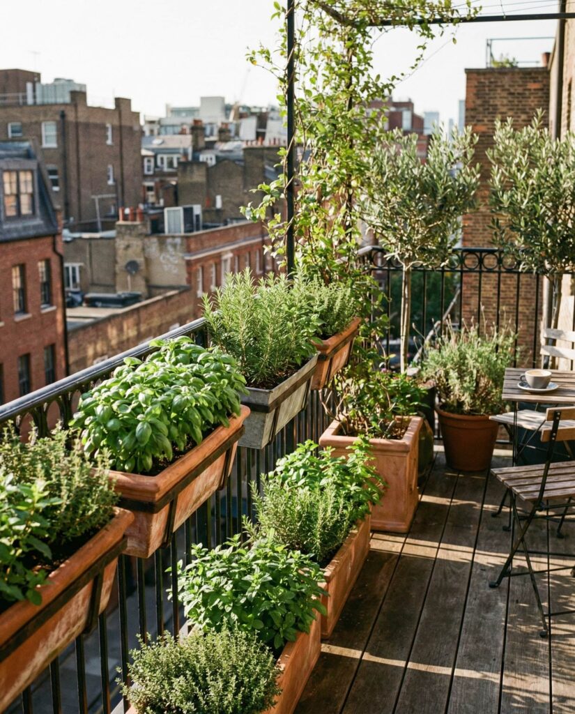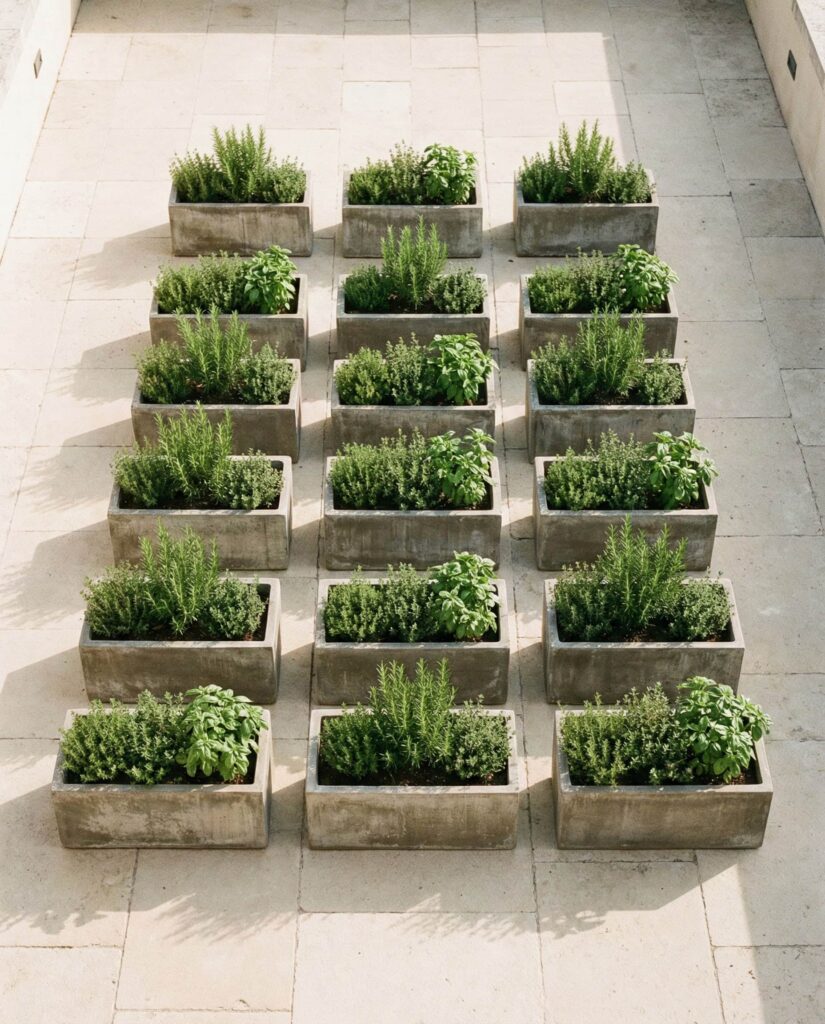On a Terrace, arranging herbs in a grid of matching outdoor container pots creates a modern, architectural look. I’ve seen this used in minimalist homes where order matters as much as function. The grid allows easy rotation and seasonal changes without redesigning the space. Design magazines often highlight repetition as a calming visual tool. This idea suits herbs that thrive in controlled soil conditions while keeping the terrace flexible for entertaining.