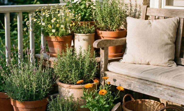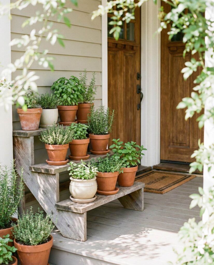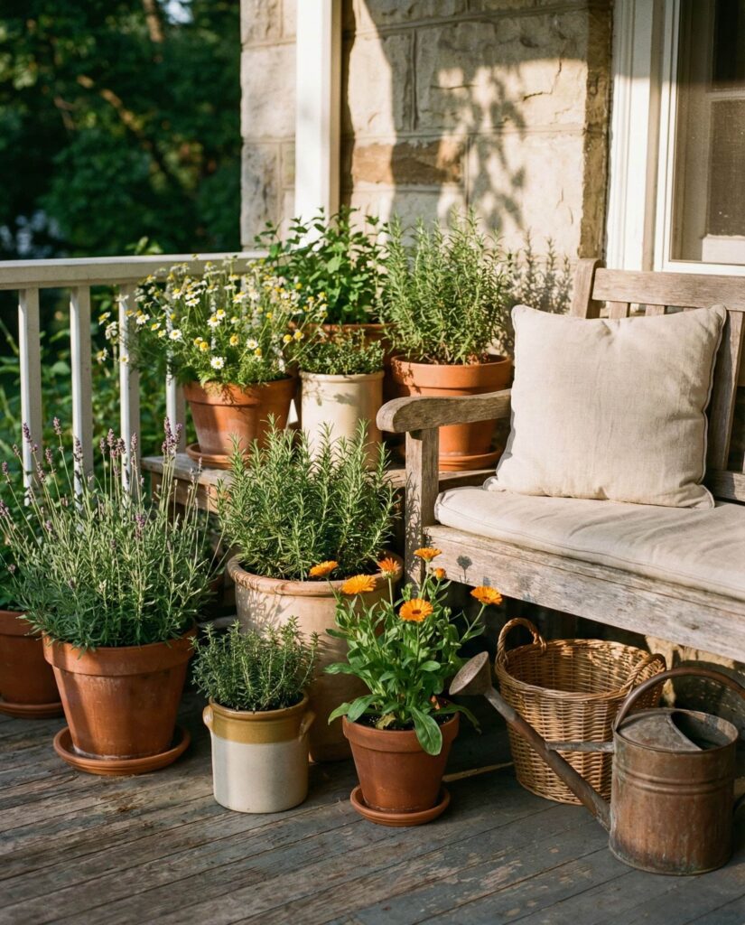 A Tiered herb setup on a Porch offers structure without heaviness. Using Outdoor potted arrangements at different heights makes herbs easy to reach and visually engaging. I’ve seen this work beautifully on farmhouse-style homes, where wood shelves soften the look. Southern Living often recommends tiered designs for airflow and sun access. This approach suits cooks who want variety without sprawling beds, and it adapts easily as seasons change. It feels curated yet casual, which is exactly what porch spaces need.