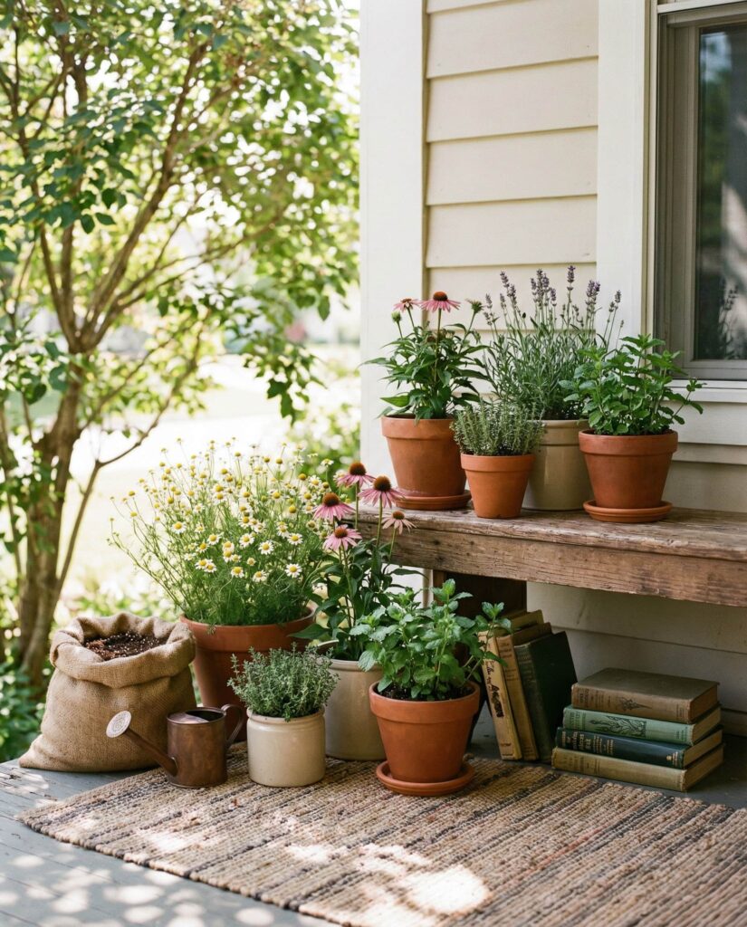 A Porch corner dedicated to Medicinal herbs blends wellness with daily life. I’ve noticed more households growing chamomile, lemon balm, and sage close to living spaces rather than hidden in backyards. This idea uses grouped containers to create a calm, intentional nook. Wellness writers often emphasize proximity as key to consistent use. The porch setting keeps herbs visible and accessible while protecting them from extreme conditions. It feels purposeful, grounded, and quietly nurturing.
