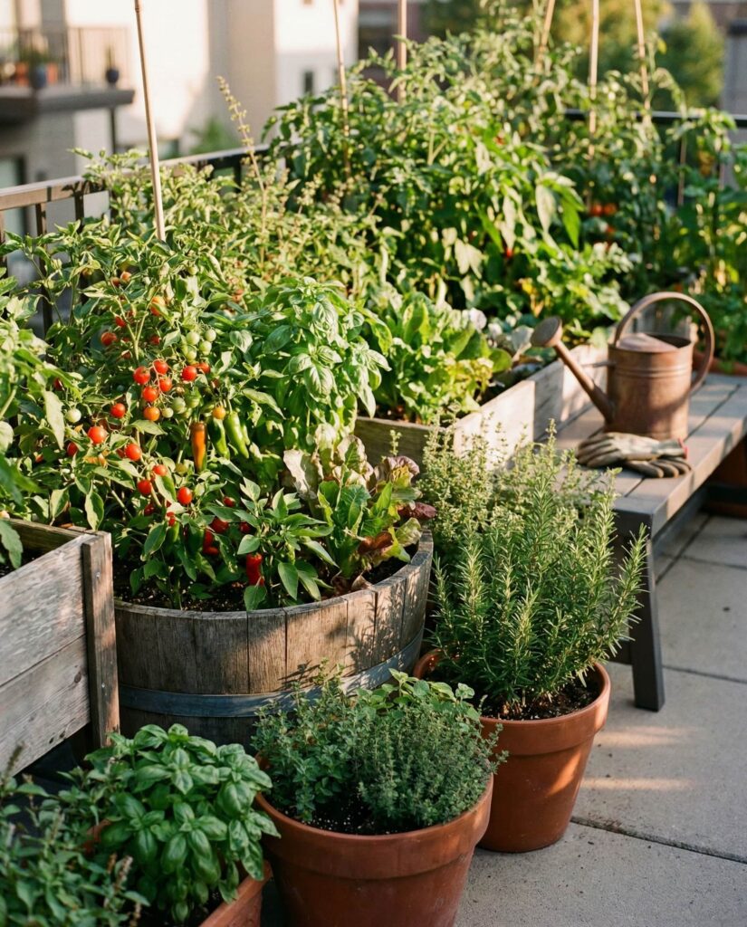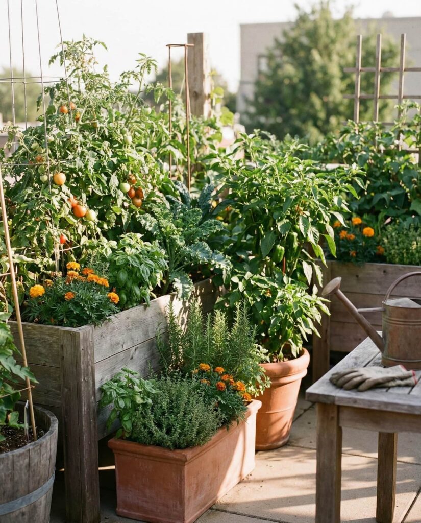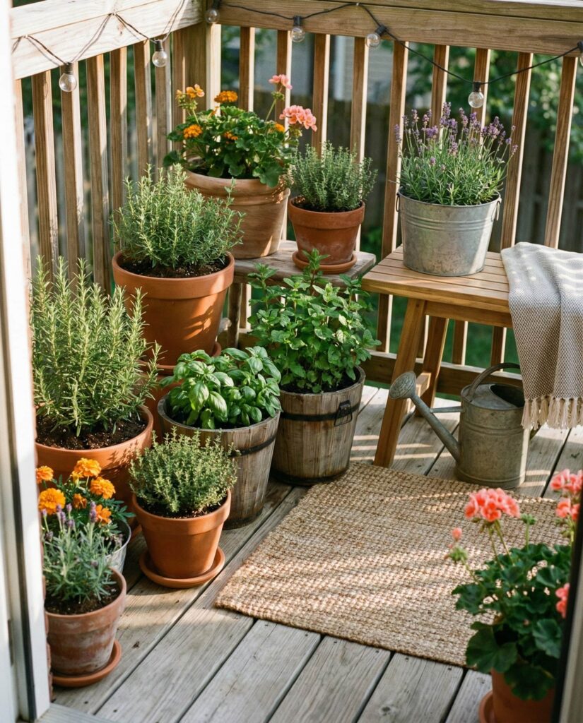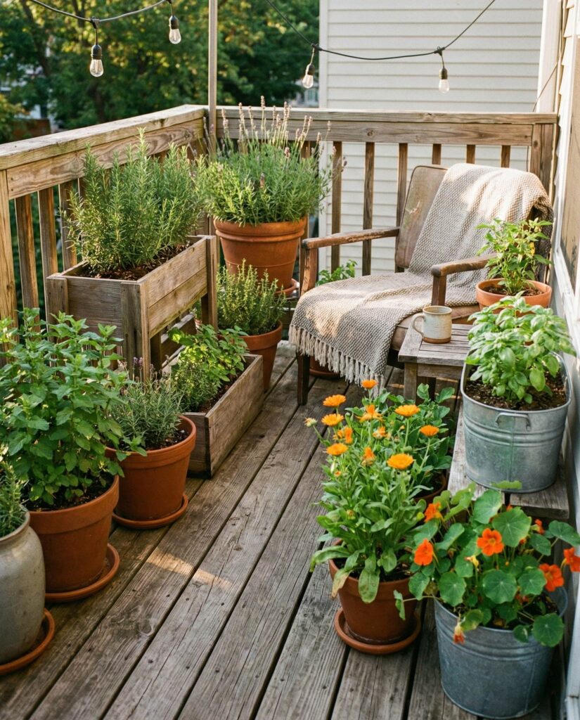 A Small deck becomes more inviting when herbs mix with Flower and foliage. This hybrid approach softens hard surfaces while keeping herbs accessible. I’ve seen it transform overlooked decks into favorite morning coffee spots. Better Homes & Gardens often suggests blending edibles with ornamentals for visual balance. It’s a welcoming idea that feels less utilitarian and more lifestyle-driven, perfect for casual entertainers.