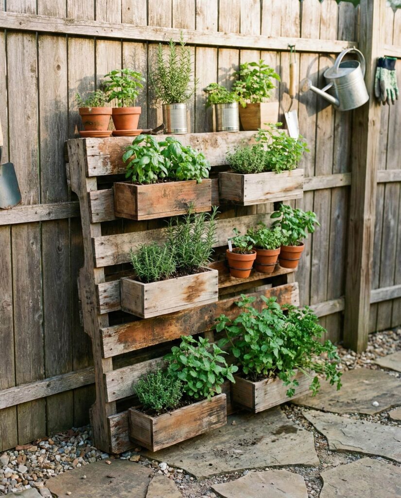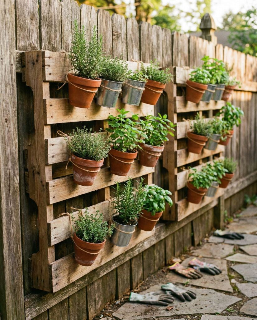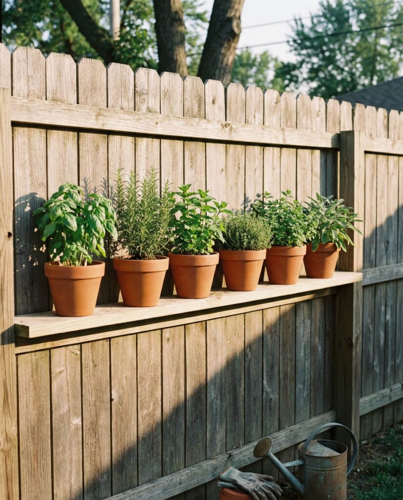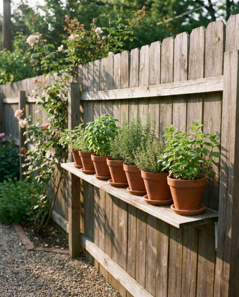 A long, linear herb setup along a Fence is an elegant way to organize herbs without taking up ground space, especially in outdoor areas where layout matters. This idea relies on outdoor potted plants placed or mounted in a continuous row, making it both Cheap and visually disciplined. I’ve seen this work beautifully in modest suburban yards where gardeners wanted order without heavy construction. Using simple brackets or shelves keeps it firmly in outdoor diy territory while allowing easy rearrangement. Design editors at Gardenista often point out that repetition brings calm, and this approach does exactly that. Herbs remain easy to harvest, airflow stays strong, and the fence transforms from background structure into a functional garden feature that feels intentional rather than improvised.
