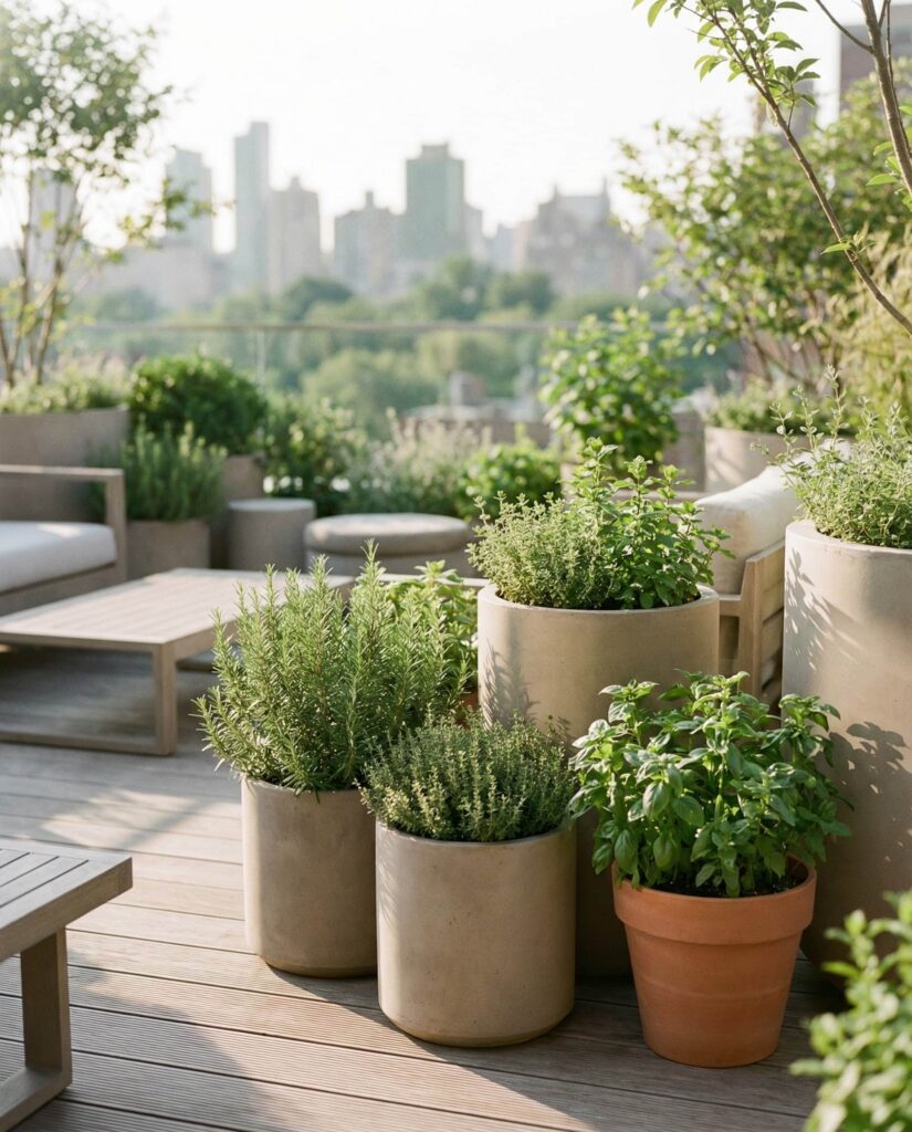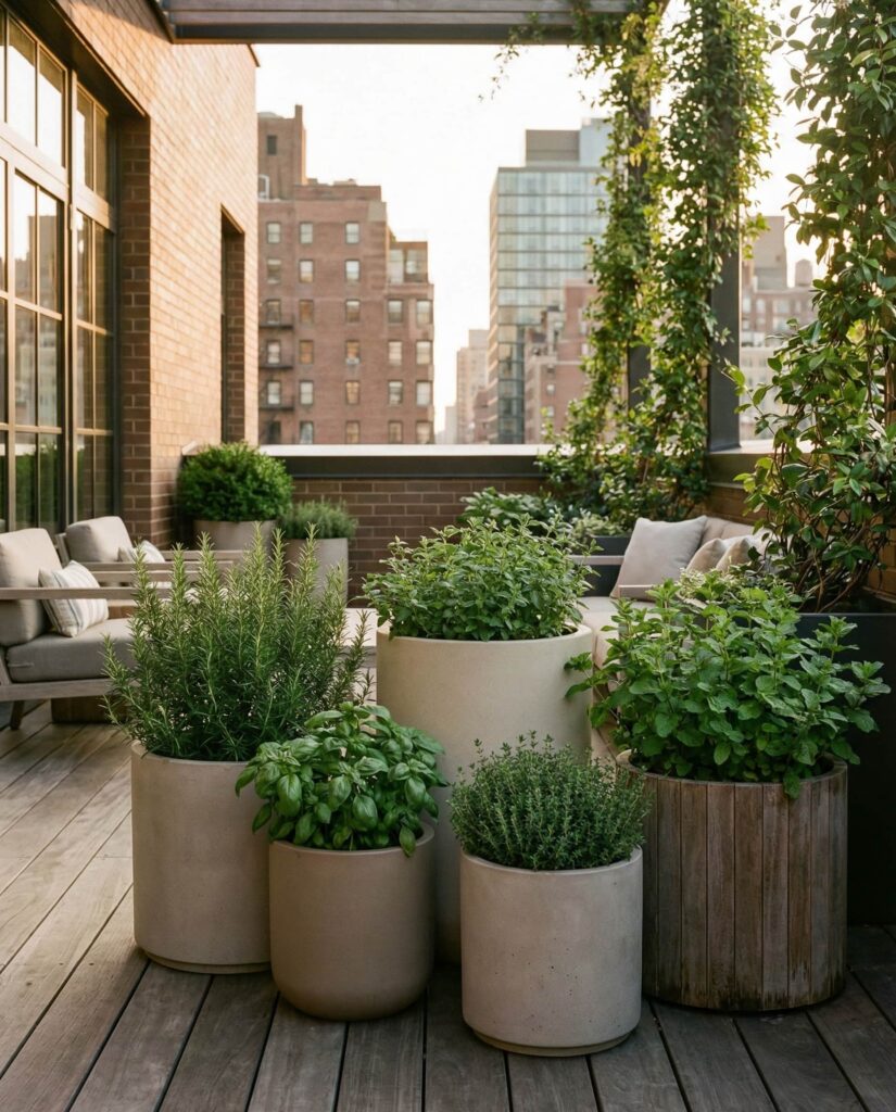A Terrace herb garden using outdoor container arrangements offers flexibility and polish. This setup suits condo owners who want greenery without committing to soil beds. I’ve noticed designers grouping containers by material for a cohesive look. According to Dwell, container gardens allow experimentation without long-term risk. It’s ideal for herbs that prefer controlled soil and drainage. The result feels curated, modern, and easy to maintain.