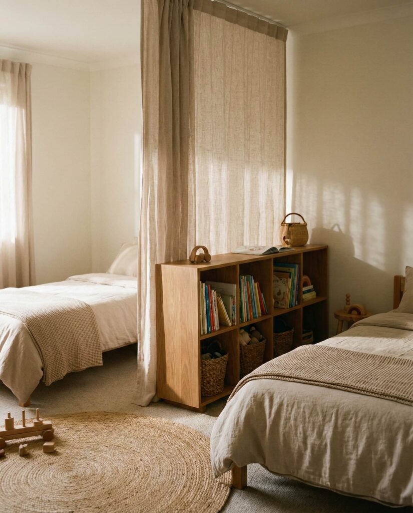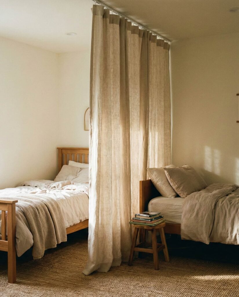 Using curtains is one of the most adaptable Ideas To split a room in modern kids shared bedrooms. This approach works especially well in a Small room 2, where permanent structures feel too heavy. A ceiling-mounted curtain track allows children to create privacy when needed and open the space during playtime. I’ve seen this solution succeed in ideas boy and girl rooms and girl and girl setups, where routines differ but togetherness still matters. Designers often recommend light fabrics in a Neutral tone to keep the room bright and calm. Curtains also support a Unisex room aesthetic and can be updated easily as kids grow, making them a low-risk, high-impact choice.