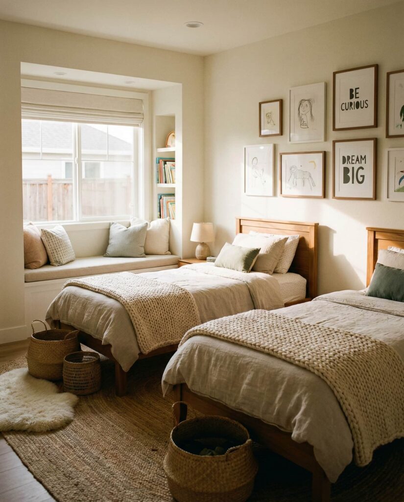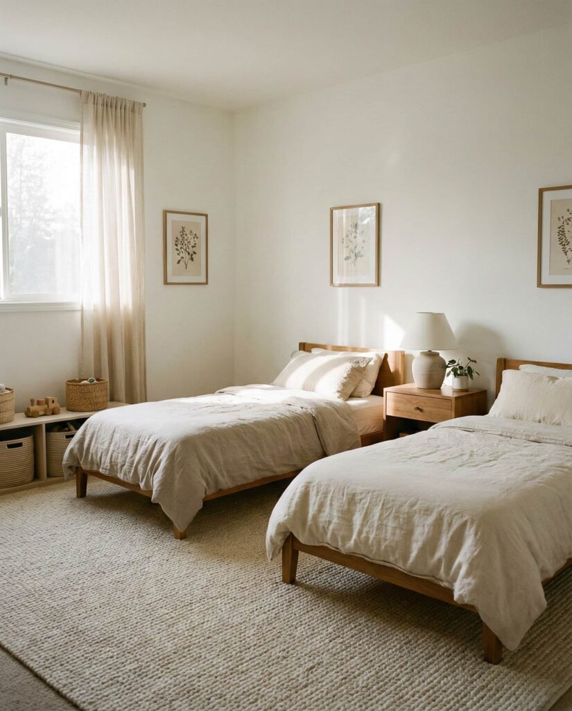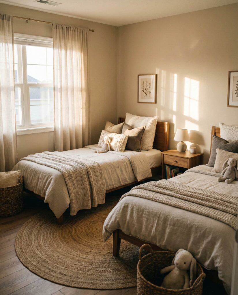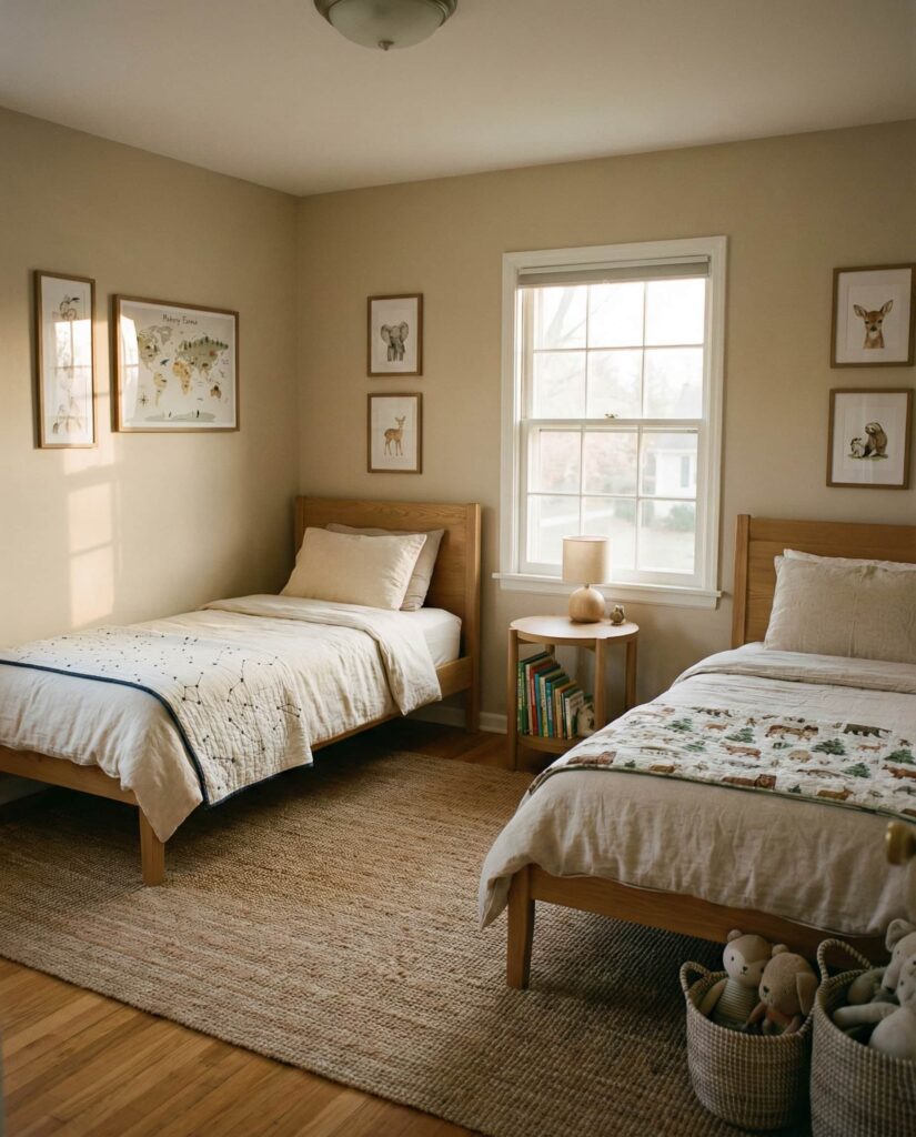 A Neutral base is one of the most future-proof Ideas for shared rooms. It works equally well for ideas boy and girl, Unisex room concepts, and changing tastes. Designers often recommend soft grays, warm whites, or beige walls paired with flexible decor accents. I’ve noticed parents appreciate how neutral palettes reduce visual noise and make rooms easier to refresh over time. Emily Henderson often highlights neutrality as a long-term design investment.
