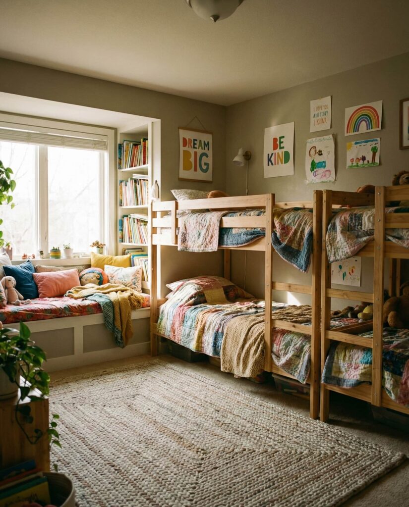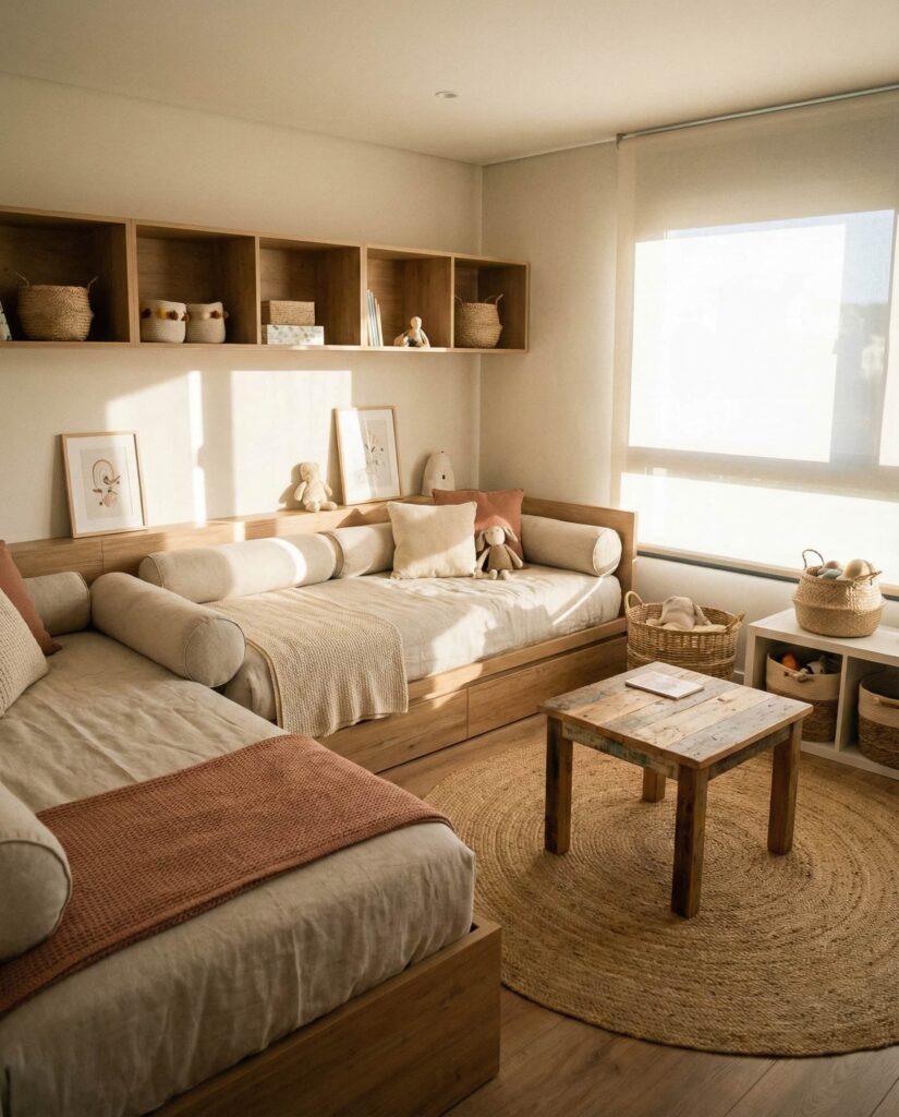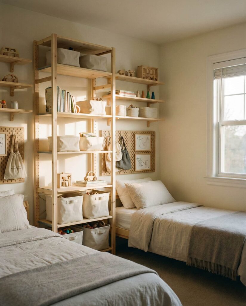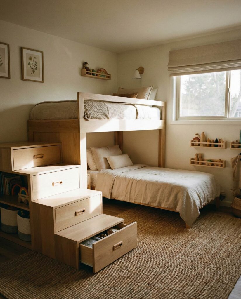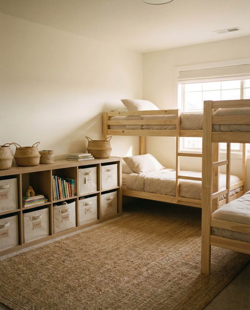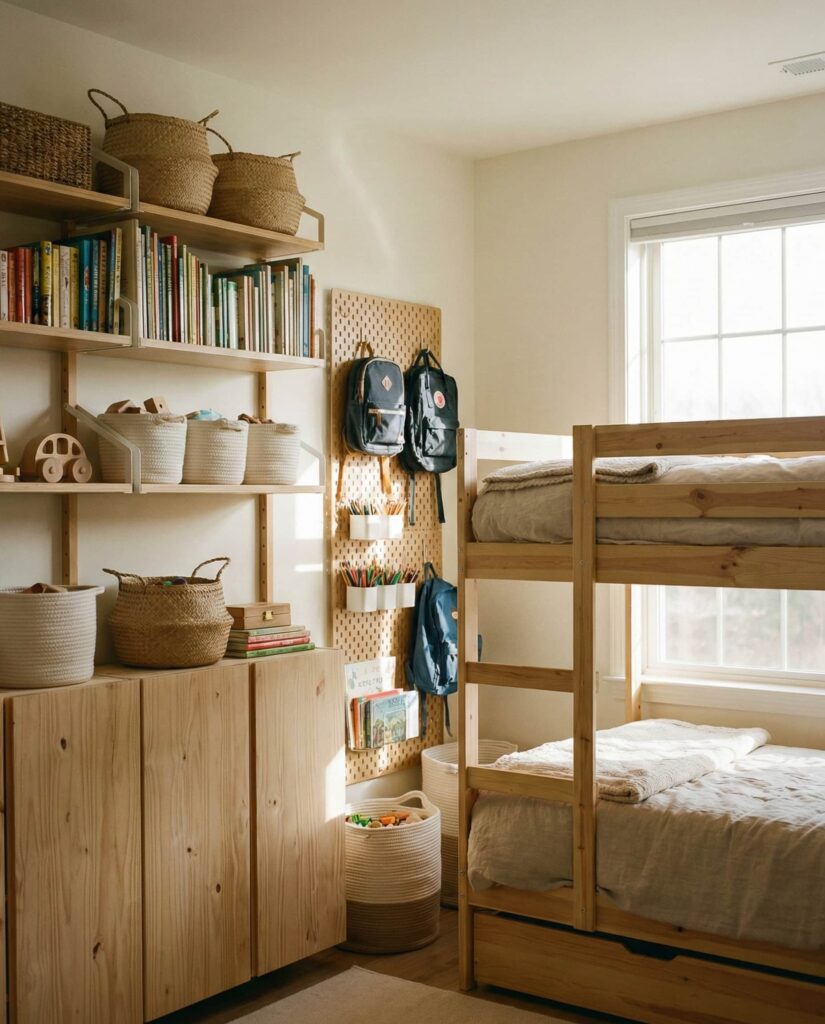 Strong Organization is the backbone of successful kids shared bedrooms. This Ideas approach focuses on clearly assigned storage—individual bins, labeled drawers, and shared shelving. In homes with boys and younger children, this clarity reduces conflict and morning stress. I’ve personally seen families transform tense spaces simply by redefining storage zones. Real Simple frequently emphasizes that organized rooms support emotional well-being, not just tidiness.