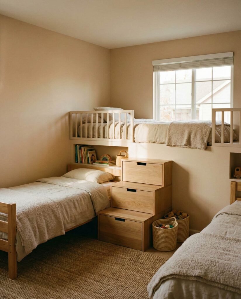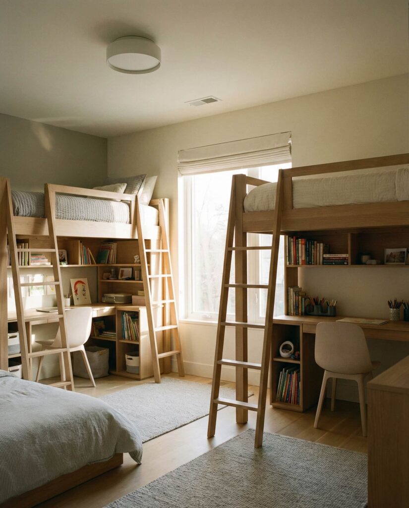 One of the more forward-looking Ideas for kids shared bedrooms is using loft beds to clearly define personal zones underneath. This solution works particularly well when parents need Small space saving strategies in a Small room 2. Each child gets their own sleeping loft, while the space below can be used for desks, reading nooks, or storage. I’ve seen this layout reduce sibling tension because everyone has a clear “this is mine” area. Designers often recommend keeping the structure Neutral and using lighting or rugs for subtle personalization, making it suitable for boys, girl and girl, or ideas boy and girl rooms.