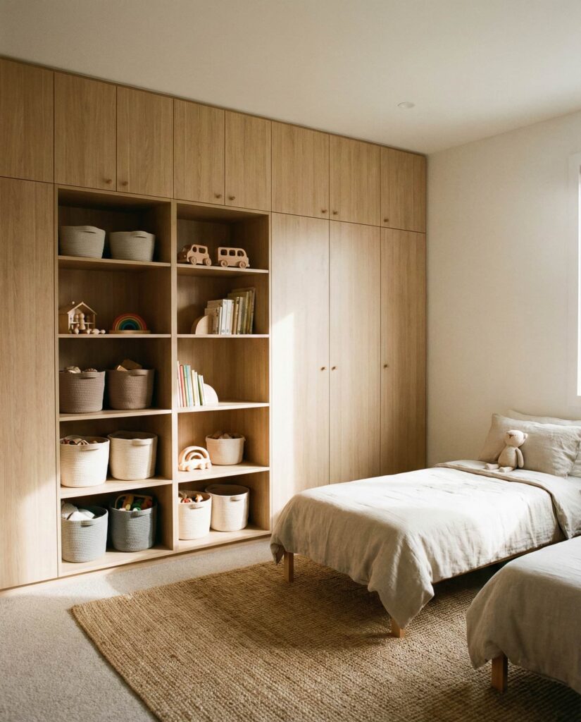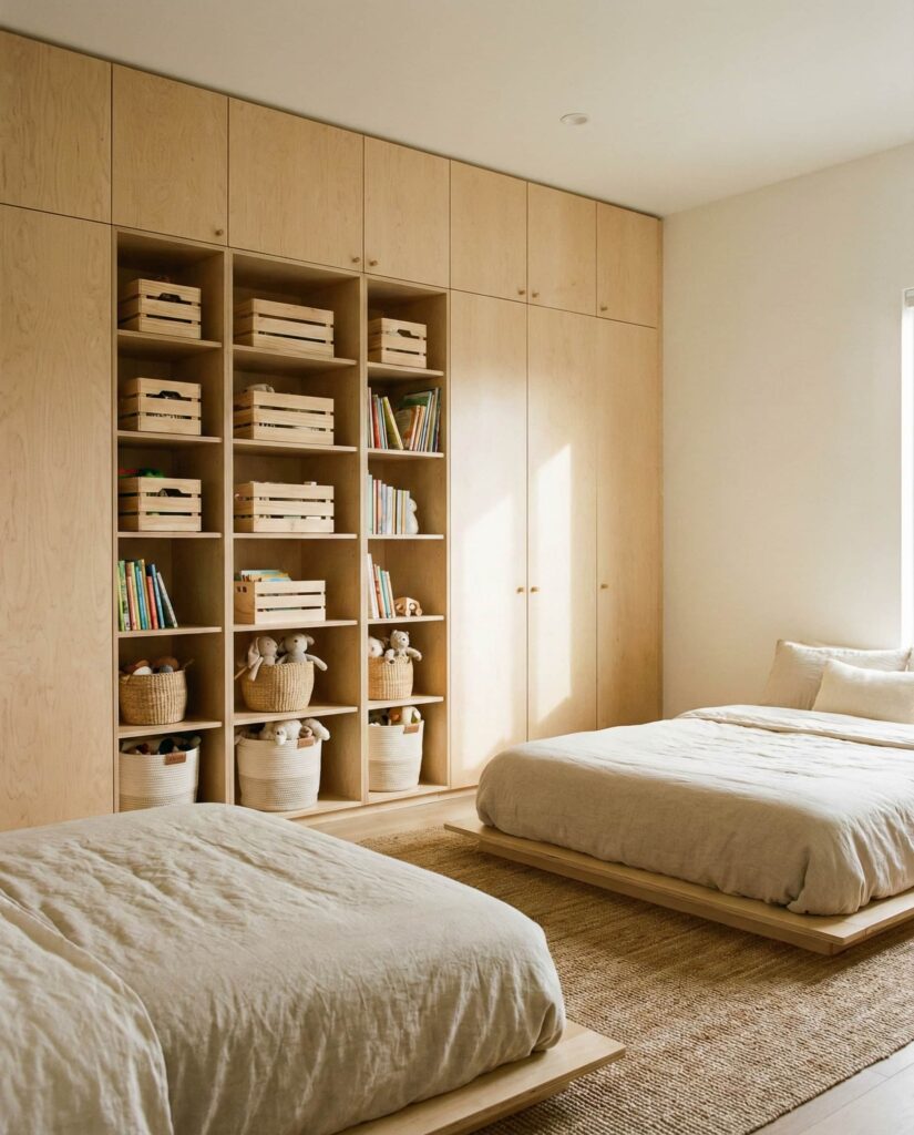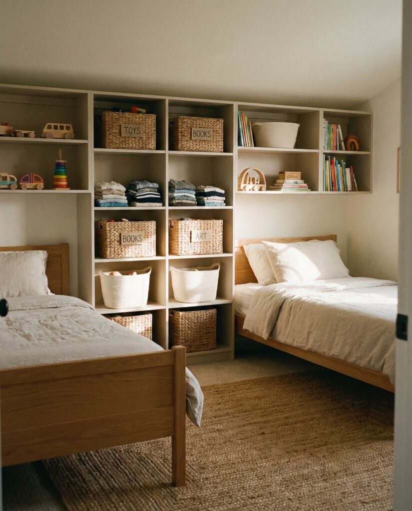 A full storage wall is one of the most practical Ideas for long-term Organization in kids shared bedrooms. Floor-to-ceiling cabinets, cubbies, and drawers reduce clutter and keep personal items clearly separated. I’ve seen this approach transform chaotic rooms, especially in homes with boys who accumulate sports gear and toys quickly. Designers often recommend a unified Neutral finish so storage blends seamlessly into the room rather than dominating it. This solution supports calmer routines and easier cleanup.
