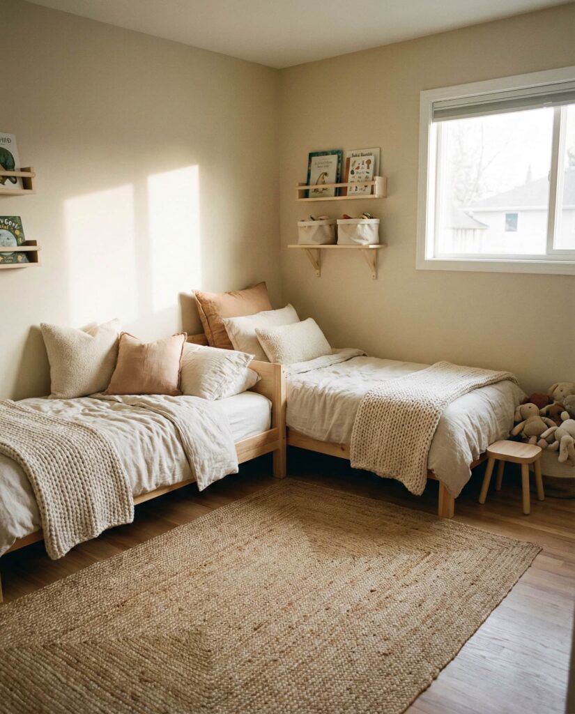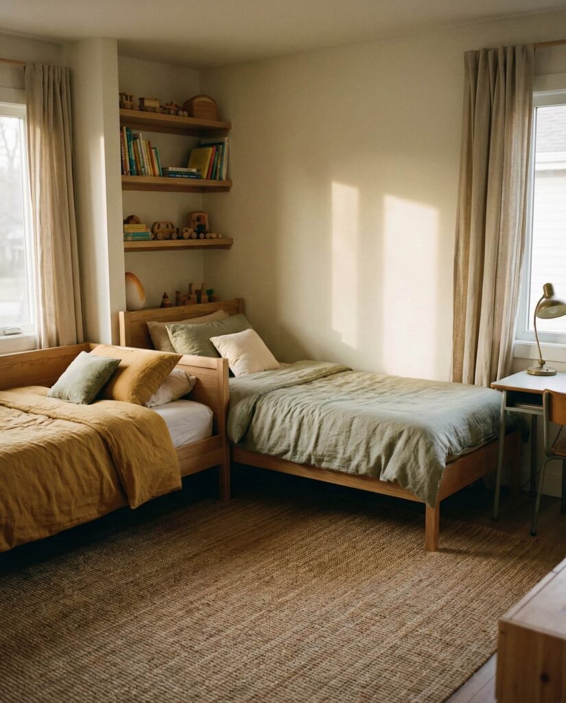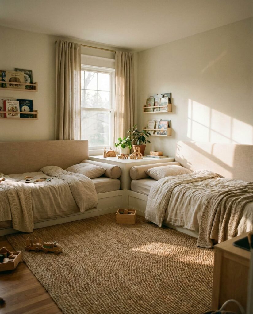 Not every room is a perfect rectangle, which is why L-shaped bed arrangements remain smart Ideas for shared spaces. This layout places beds along adjacent walls, creating natural separation without needing a Room divider. I’ve seen this work beautifully in older homes with unusual proportions. It’s especially effective for ideas boy and girl or girl and girl setups, allowing personalization without visual clutter. Designers often recommend keeping bedding cohesive to maintain balance.