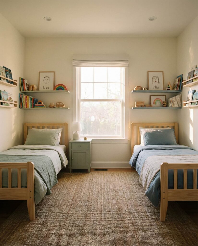 A mirrored layout is a timeless Ideas approach for kids shared bedrooms, especially when fairness matters. This setup places identical furniture on both sides of the room, from beds to nightstands and shelves. It works beautifully with 2 twin beds in one room and helps avoid daily arguments over space. I’ve noticed parents appreciate how symmetry makes even a Small room 2 feel orderly. Designers often pair this approach with soft decor accents so the room feels warm rather than rigid, making it ideal for ideas sisters or boys sharing.