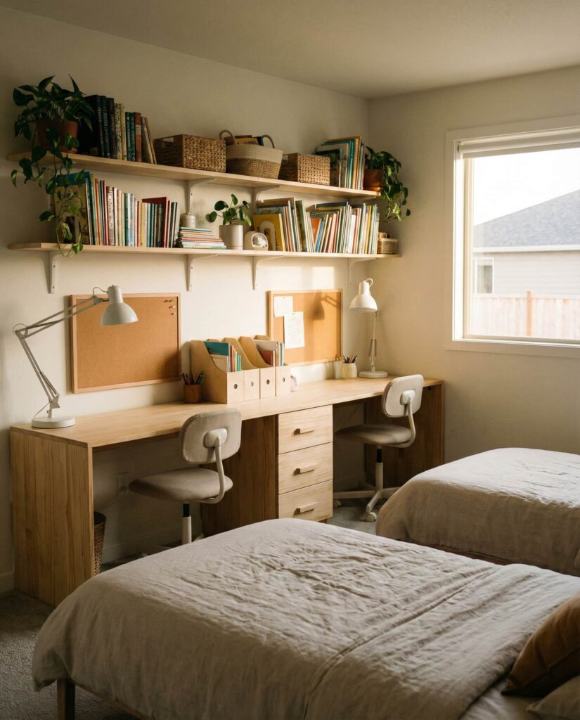 Creating a shared study area is one of the most practical Ideas for older children sharing a room. Instead of duplicating desks, designers often recommend a long shared workspace with clearly defined sides. I’ve observed that this setup encourages cooperation while still respecting personal space. It works well alongside 2 twin beds in one room, especially in academic-focused households.