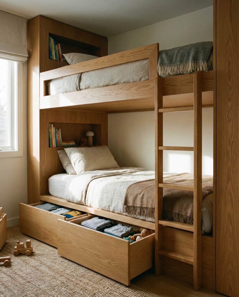 Modern Bunk beds have evolved far beyond the basics many parents remember. Today’s Ideas focus on safety, built-in Organization, and visual warmth, making them ideal for Small space saving solutions. In a boy and girl setup, bunk beds allow shared sleeping areas while freeing floor space for play or study. I’ve noticed designers increasingly recommend solid wood finishes and integrated drawers, a trend also highlighted by The Spruce. These beds feel intentional rather than temporary, supporting long-term use as children grow.