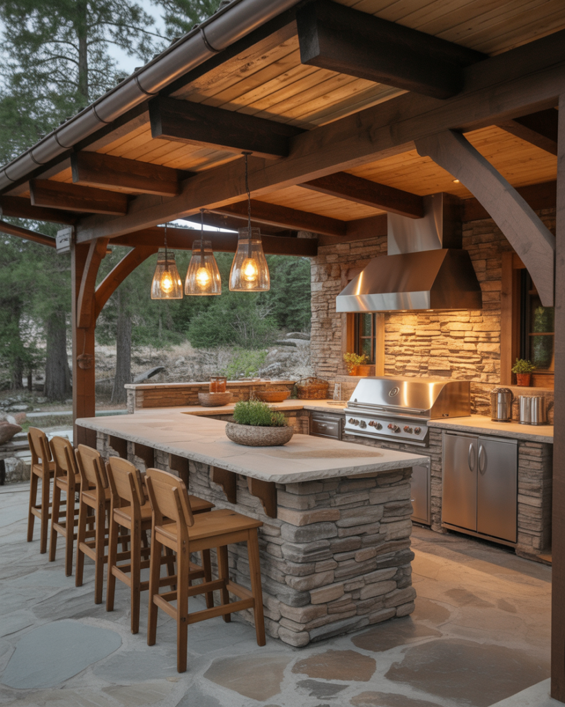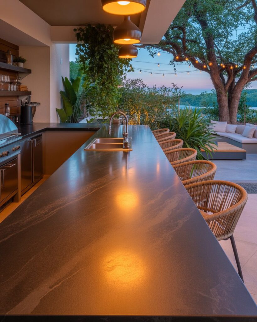 Creating an Outdoor kitchen bar transforms everyday meals into relaxed gatherings outside. With durable stone countertops, cozy seating, and breezy decor, this setup fits patios, decks, or even compact apartment balconies. It brings a resort mood straight to your home, ideal for warm evenings with friends.