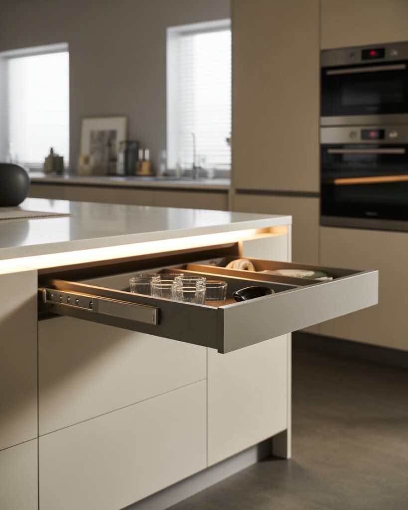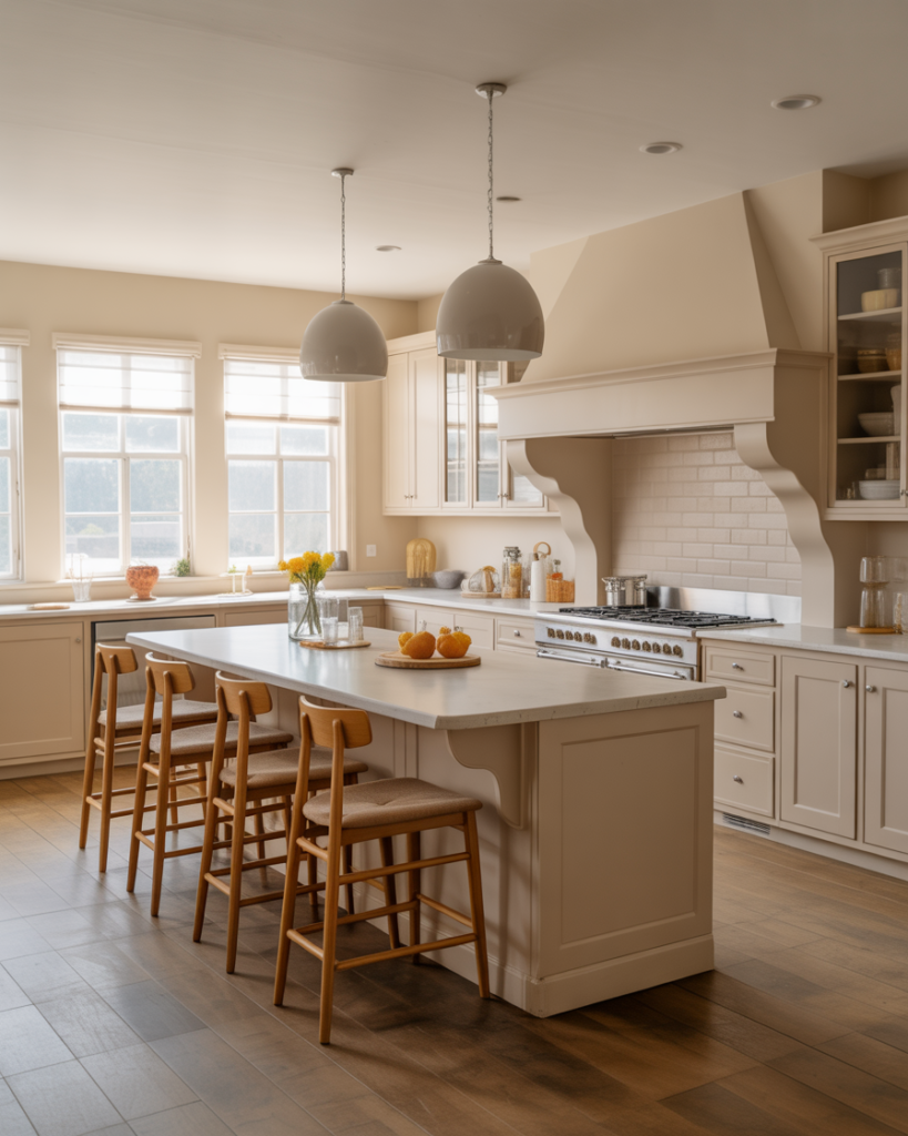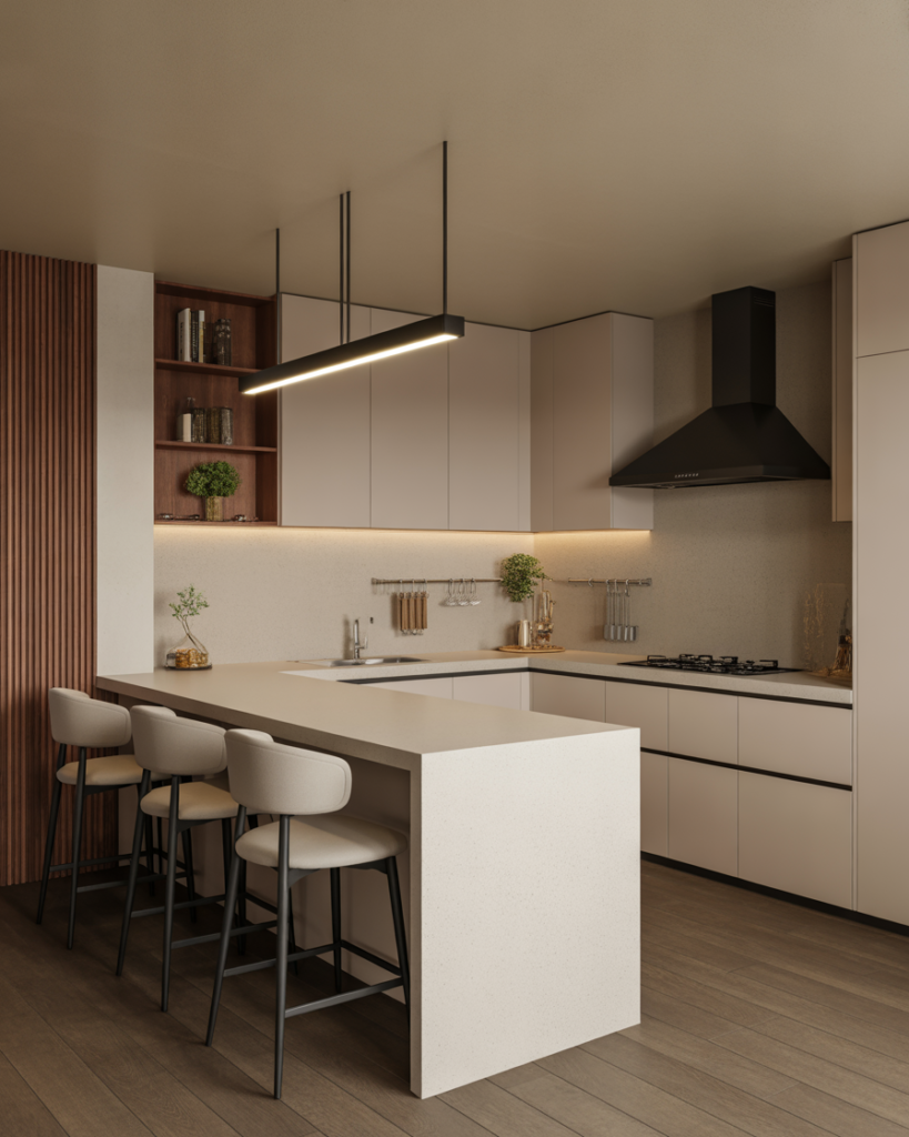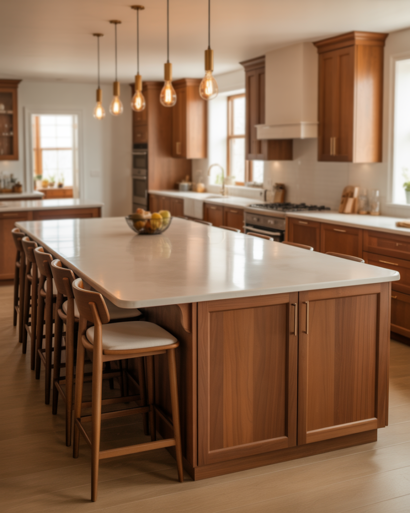A generous kitchen island that doubles as a bar brings people together while offering extra countertops for cooking. It suits l shape rooms or open layouts that encourage social flow. Families love how it becomes a natural stop for breakfast, homework, or weekend cocktails without feeling crowded.