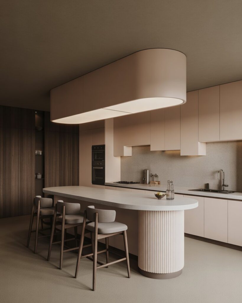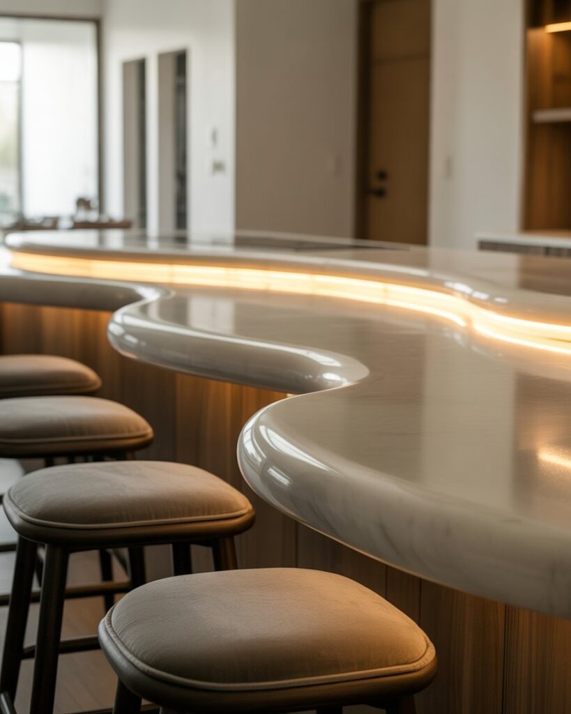 A curved kitchen bar brings a soft modern touch that feels welcoming in small spaces or open layouts. Smooth arcs, rounded countertops, and gentle lighting create a relaxed atmosphere that encourages conversation. It works beautifully for home owners who want something sculptural yet functional.
