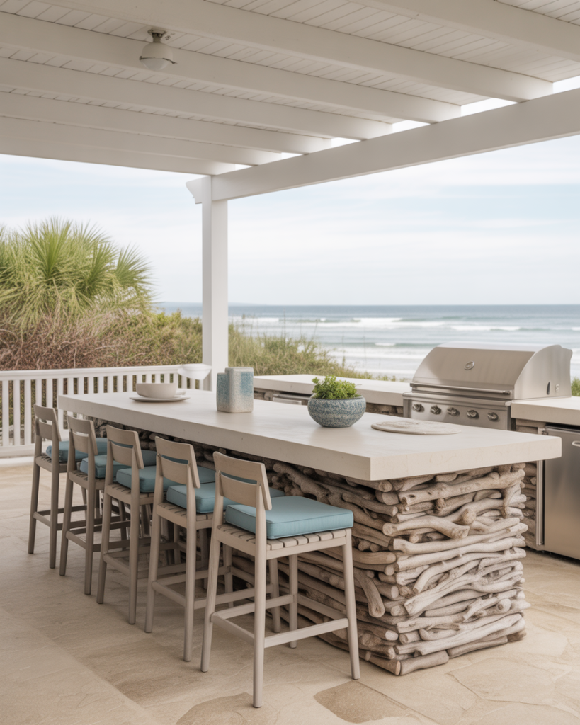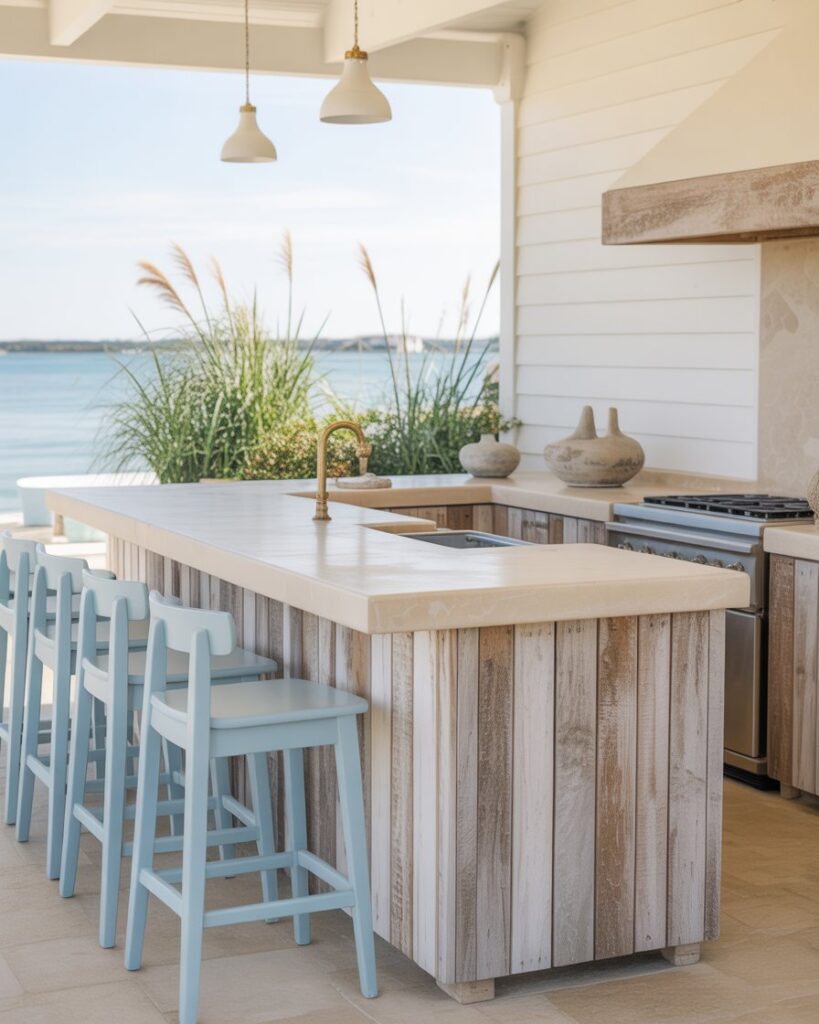 A breezy coastal-style Outdoor bar fits patios and outside decks where sea-inspired tones meet durable materials. Light wood, pale stone countertops, and relaxed decor create a beachy vibe even far from the shore. It’s perfect for anyone craving vacation energy at home.