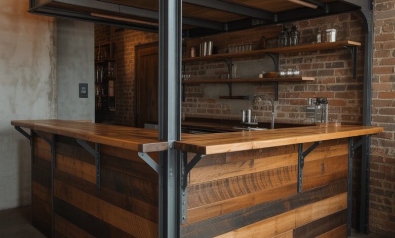 This rustic-industrial bar blends steel frames, exposed hardware, and reclaimed wood for a bold, urban appeal. It fits lofts, apartment interiors, and edgy for small spaces settings where character matters. The mix of rough and refined elements adds attitude without overwhelming the room.