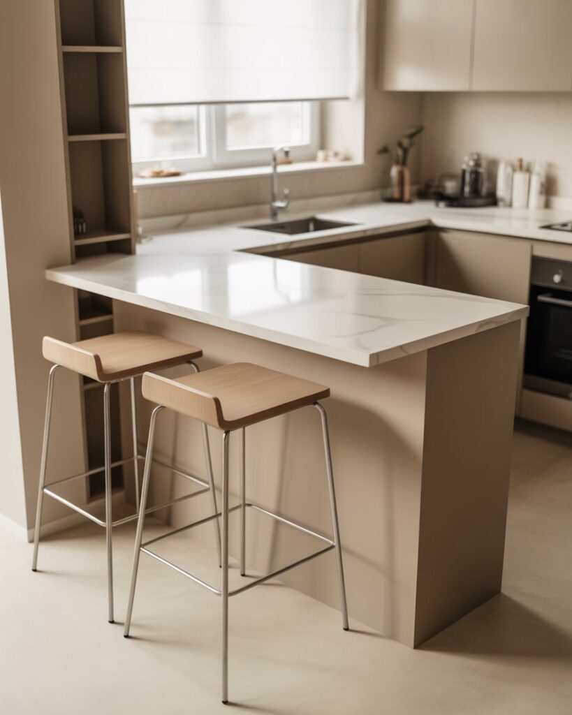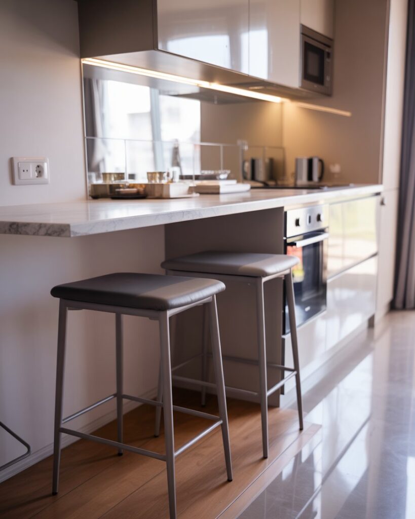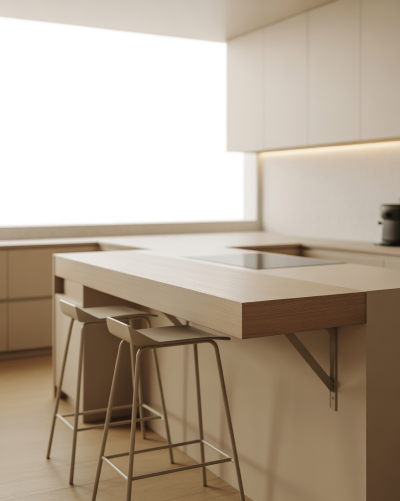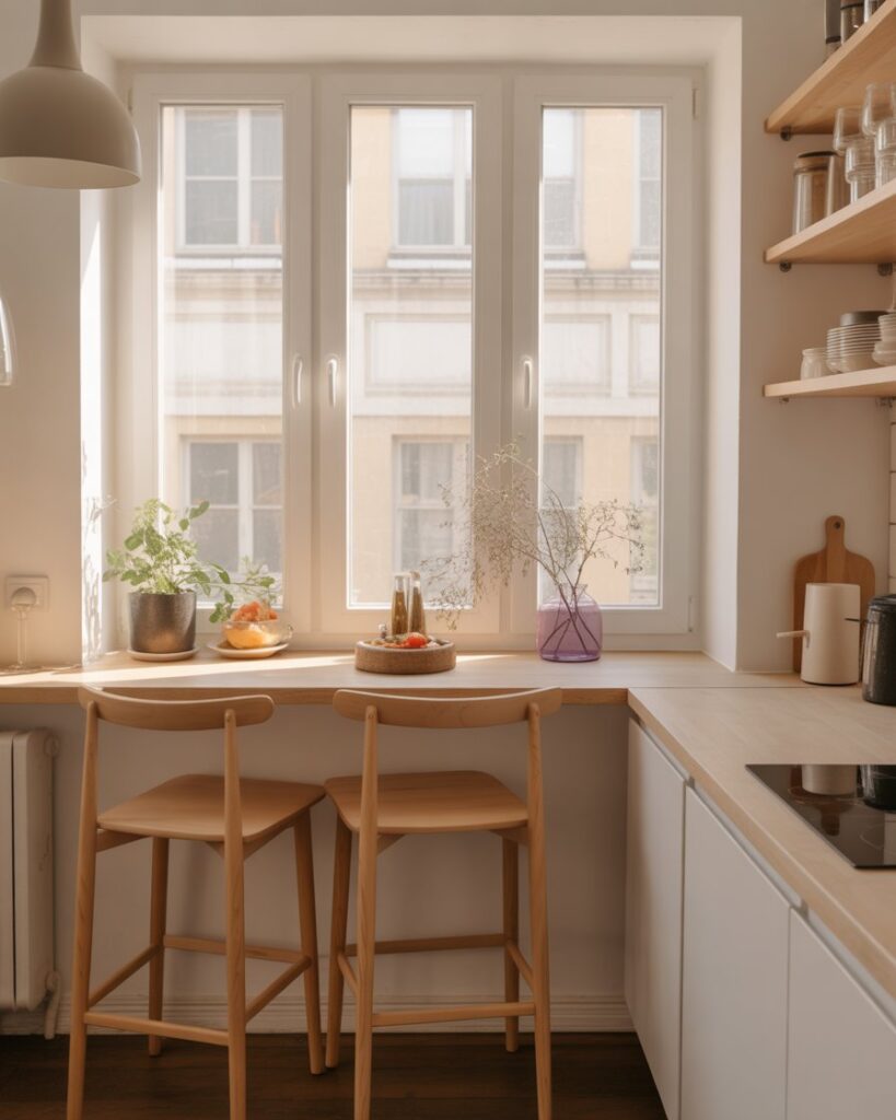A bar built against wall window zones creates a peaceful spot for morning coffee. With slim countertops decor and open views, it suits studios, townhomes, and bright home kitchens. I’ve seen friends use this idea to turn unused windowsills into charming, sunlit dining spots.