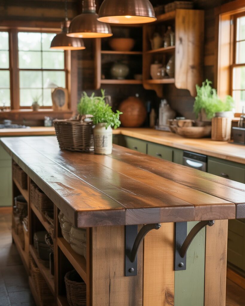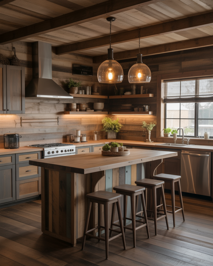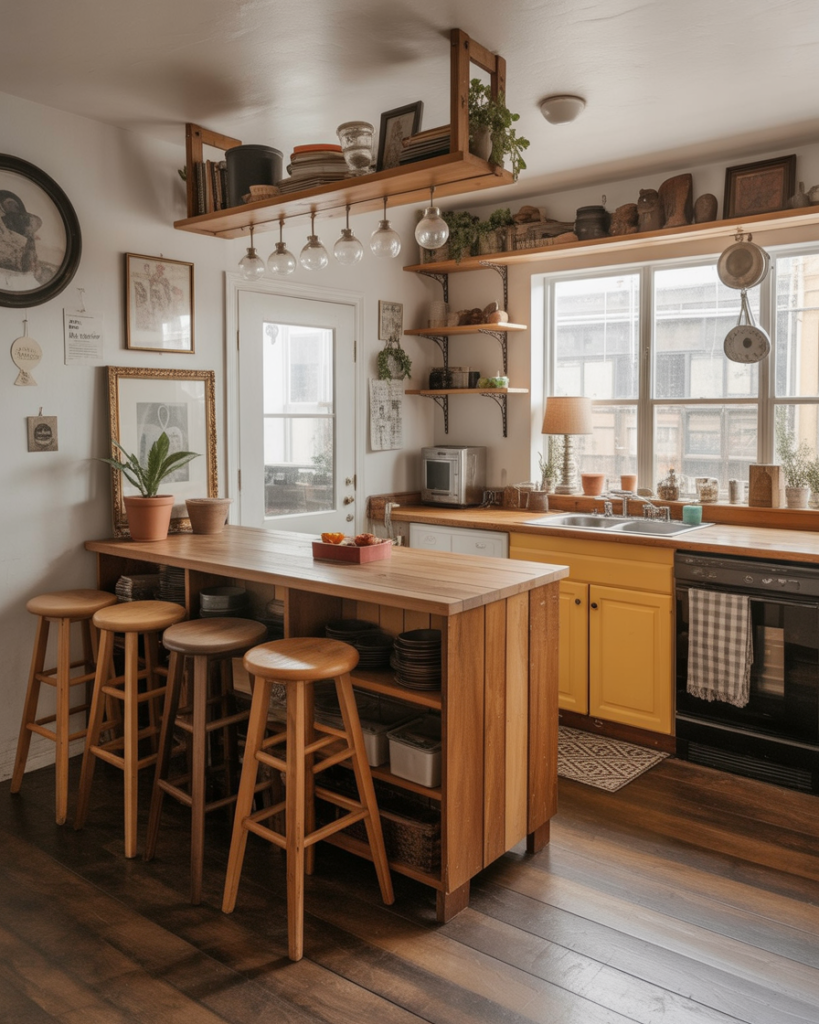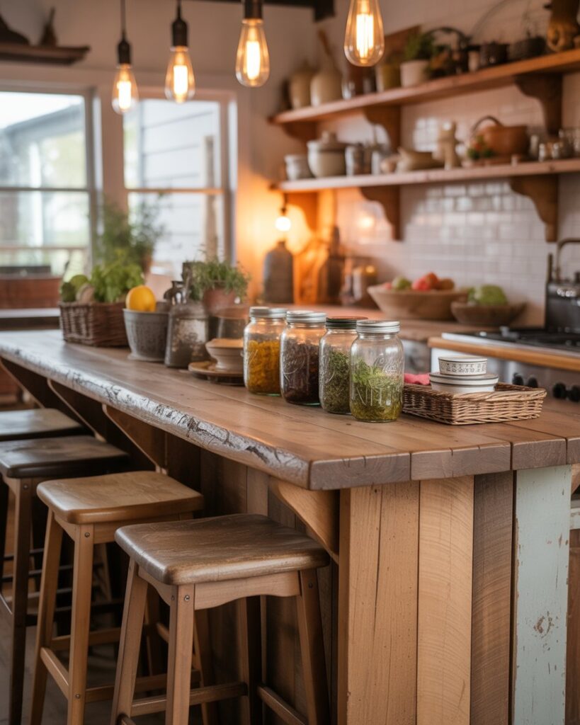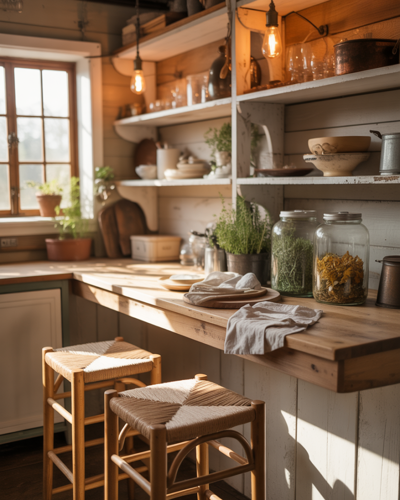 For farmhouse fans, an open-shelf bar adds warmth and nostalgic charm. Natural wood, vintage stools, and thoughtful decor bring personality to home kitchens, especially those with cozy layouts. Inspired by country cottages, it balances practicality with friendly aesthetics.