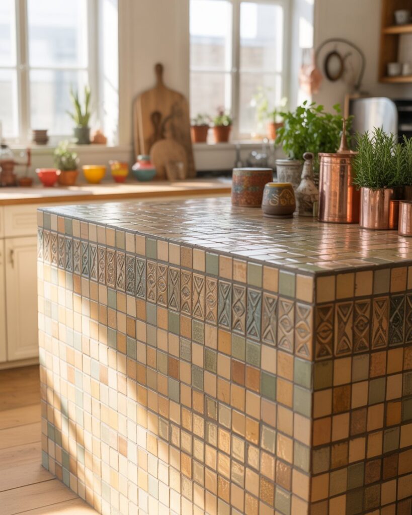 A diy tile-front bar allows homeowners to showcase creativity using colorful patterns or handmade textures. Perfect for home projects, it fits against wall or freestanding layouts and adds instant personality. This idea works well in both vintage-inspired and modern settings.