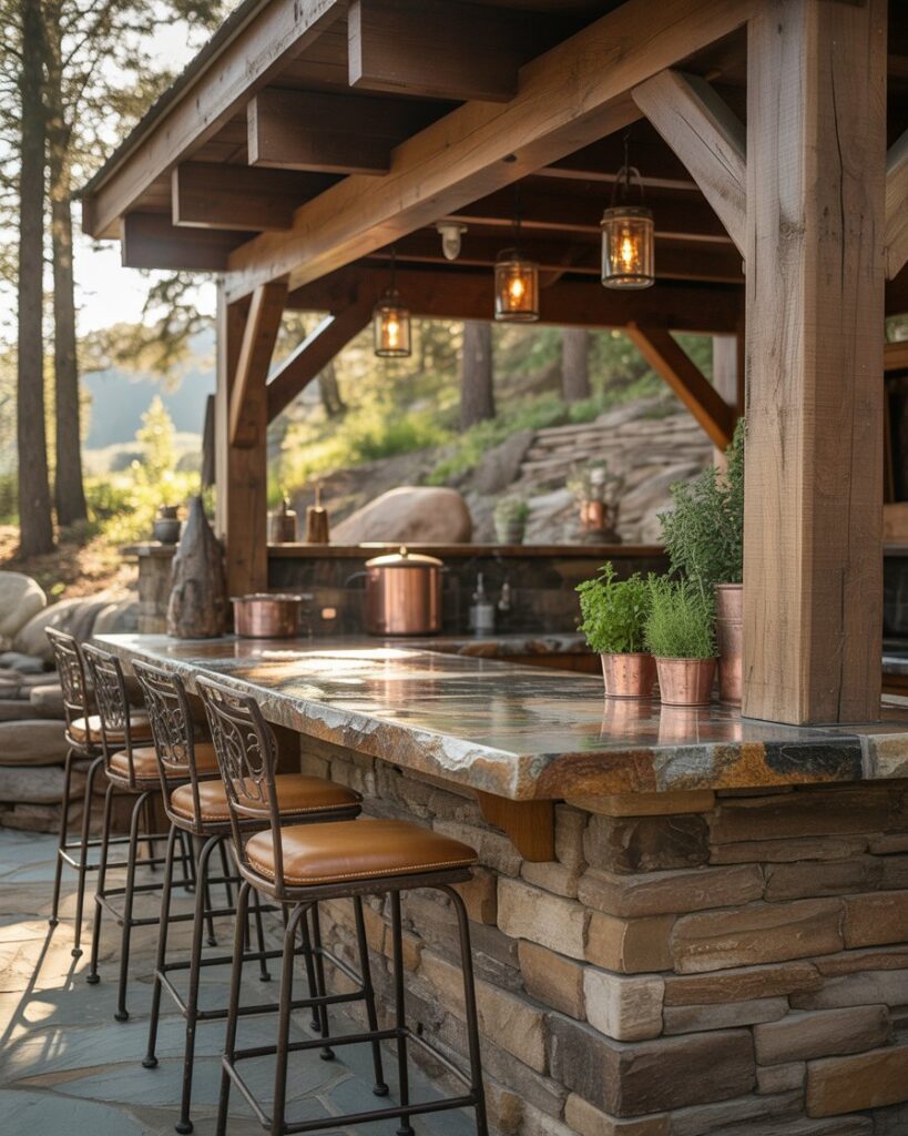 Blending natural stone with rustic charm, this Outdoor bar suits backyards and outside entertainment zones. Thick stone countertops, wood beams, and earthy decor create a grounded, lodge-like feel. It’s great for hosting evenings around a fire or garden.