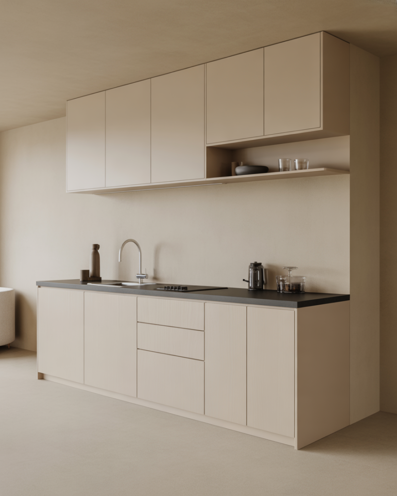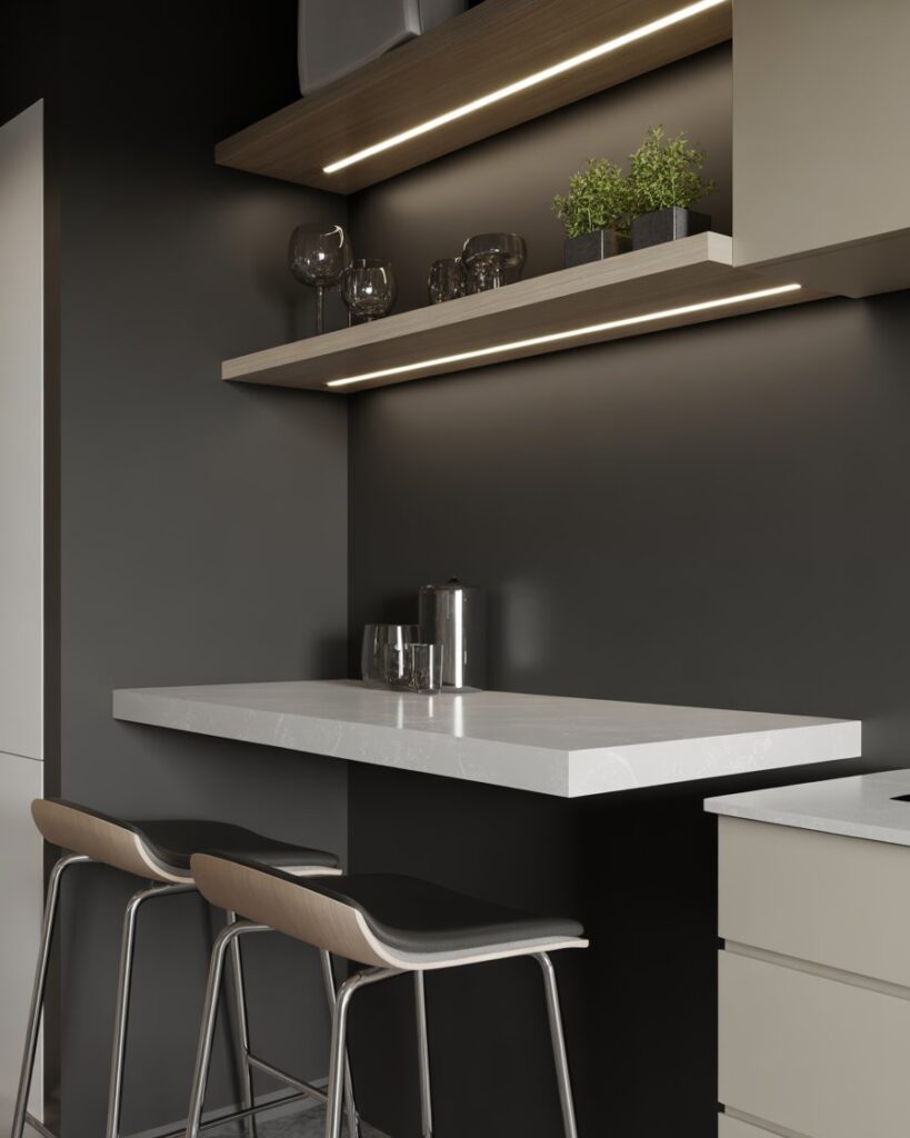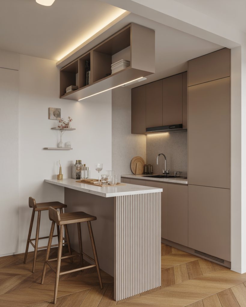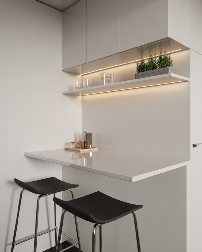 A narrow modern strip-style bar works perfectly against wall for tight for small spaces kitchens. Clean lines, light countertops, and subtle accents create a calm, uncluttered look. This idea is popular among fans of Scandinavian design who value simplicity.