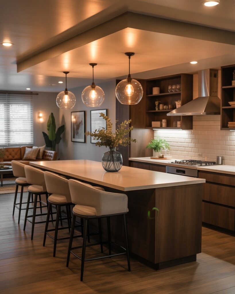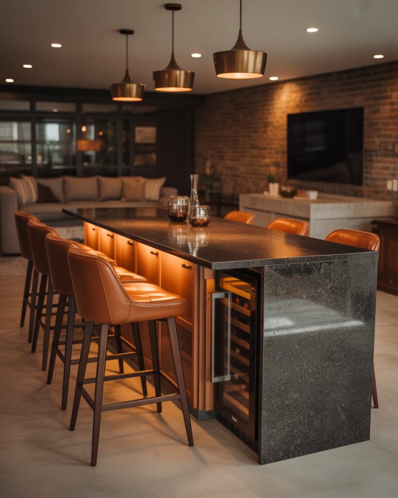 Combining a basement hangout with a kitchen island bar makes the space more social and functional. Smooth countertops decor, fun lighting, and relaxed seating create a lounge-like environment ideal for movie nights or gatherings. It brings new life to underused rooms.