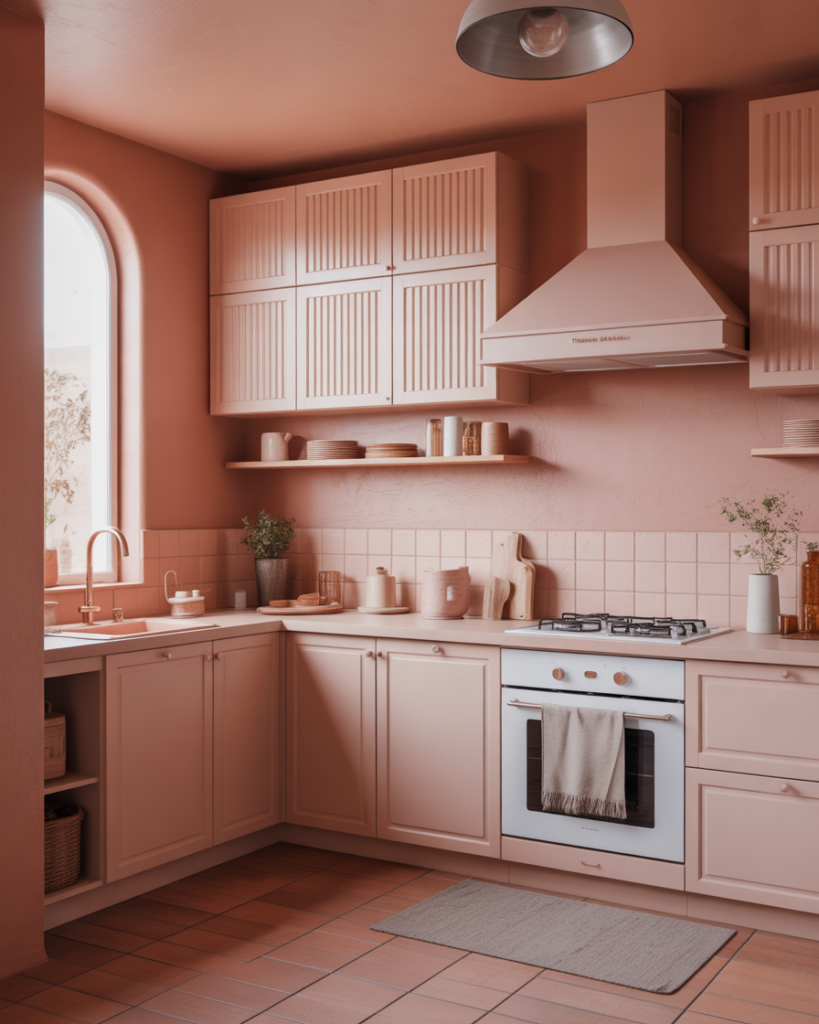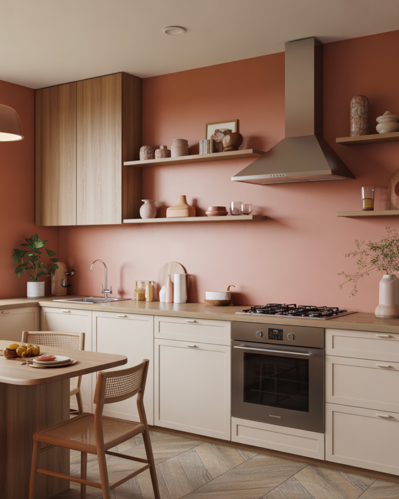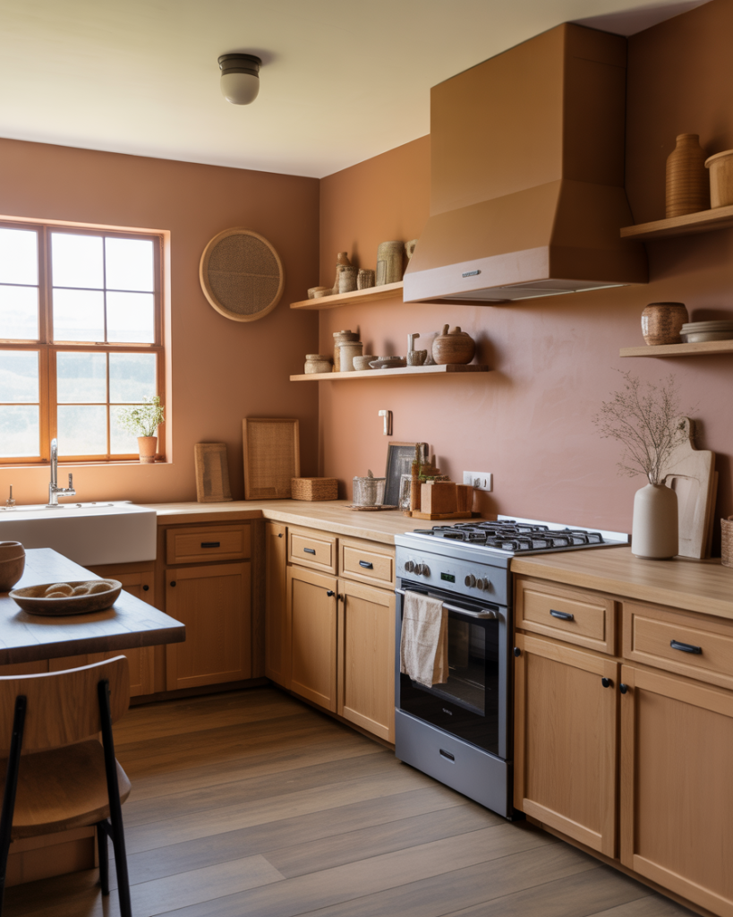 Terracotta with soft peach undertones offers an approachable warmth that blends nicely with oak cabinets or adds contrast with white cabinets. This shade is perfect for walls in farmhouse, earthy, or modern kitchens and adds personality without overwhelming the room. Many decorators expect this color to be one of the best 2026 ideas, thanks to its ability to create a friendly, uplifting atmosphere.