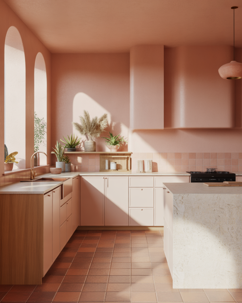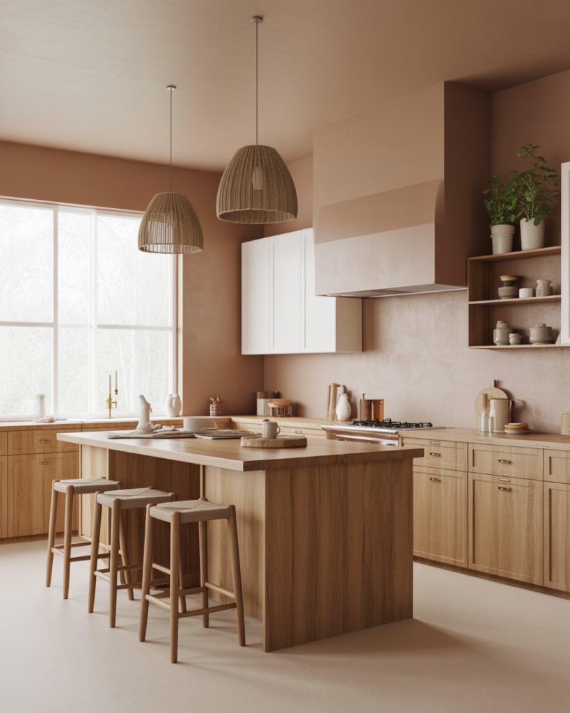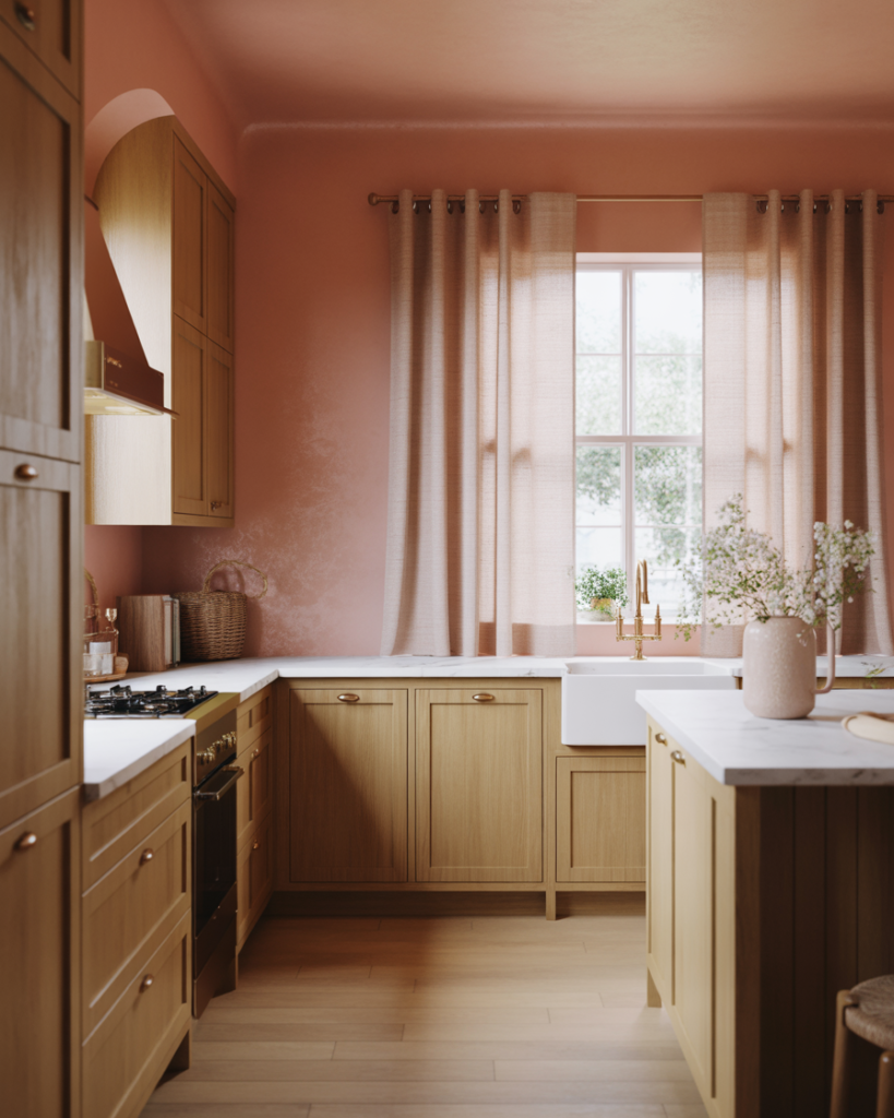 A subtle blush acts as a modern neutral while adding a gentle glow to kitchens. It fits beautifully with oak cabinets, white cabinets, or mixed cabinets in modern farmhouse and cottage interiors. This shade is one of the best ideas for walls in 2026 because it softens sharper lines and brings warmth without leaning overly feminine. It’s a refined yet friendly color that feels fresh and personal.