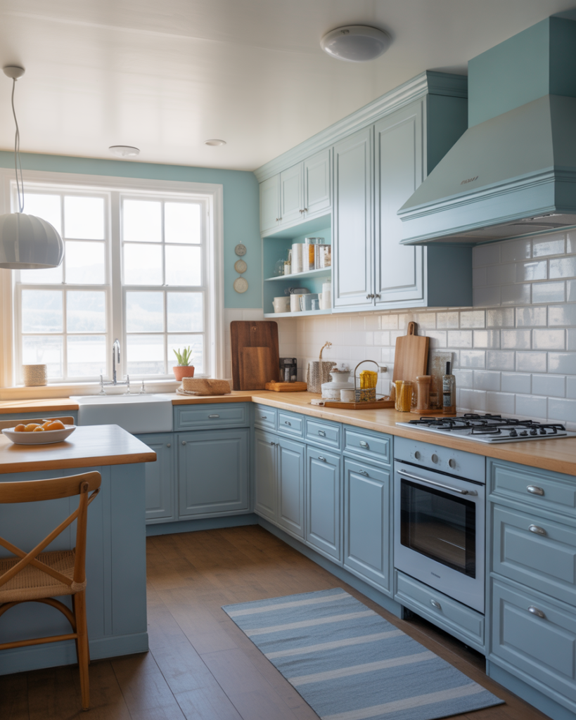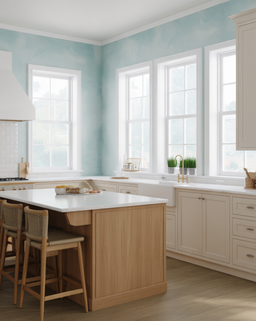 A gentle coastal mist blue feels refreshing and relaxed, especially when paired with white cabinets or light oak cabinets. This airy tone works well for walls in modern farmhouse or beach-inspired kitchens where a soft breeze-like palette is welcome. Designers note it’s becoming popular for 2026 thanks to its calm, uncluttered mood and versatility with mixed cabinets and natural textures.
