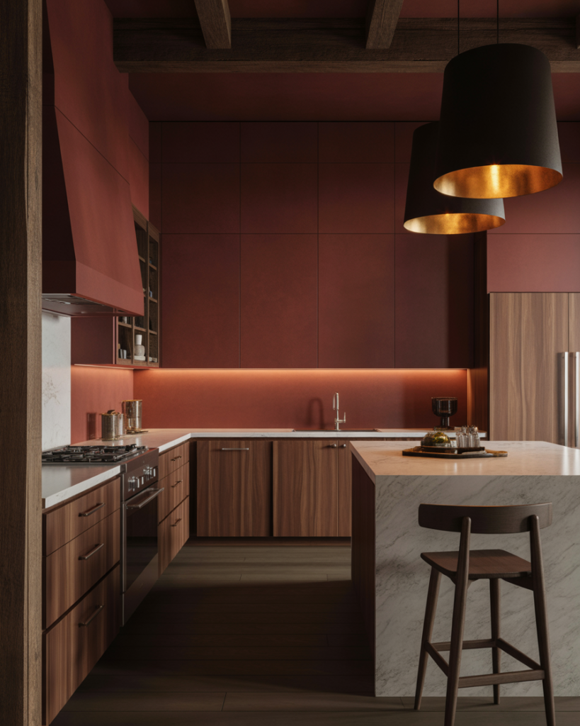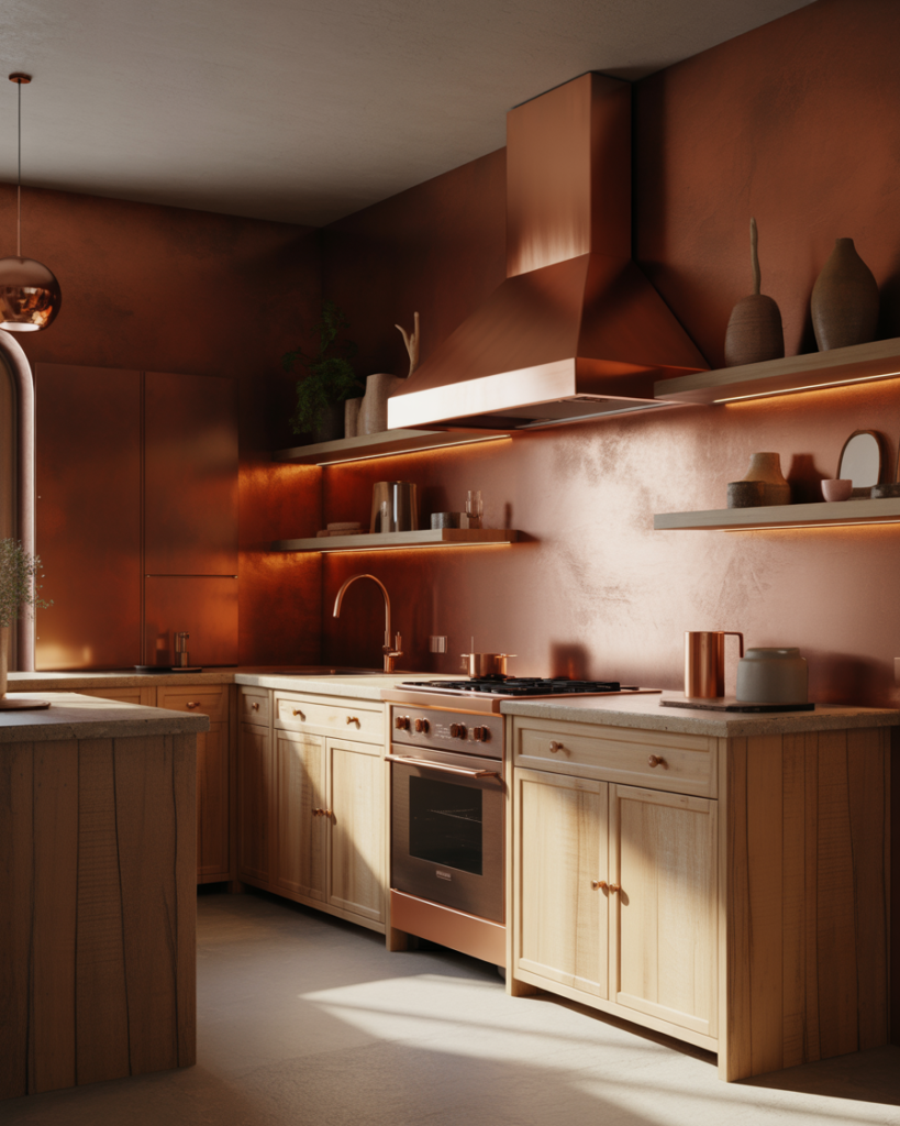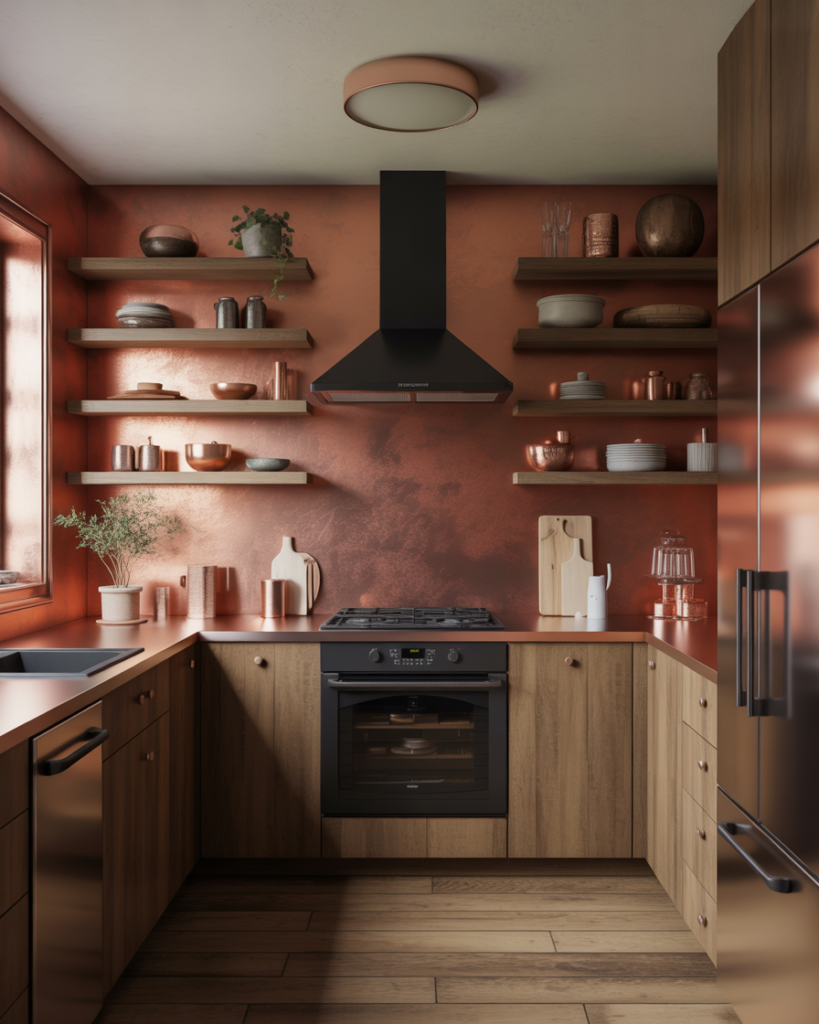 Burnt copper adds warmth and personality, especially with wood cabinets or darker materials. This color suits rustic, earthy, or artisan-inspired kitchens where homeowners want a handcrafted feel. As designers move away from flat grays, burnt copper is emerging as a standout idea for walls in 2026, offering richness without overwhelming the room and pairing beautifully with dark wood accents.