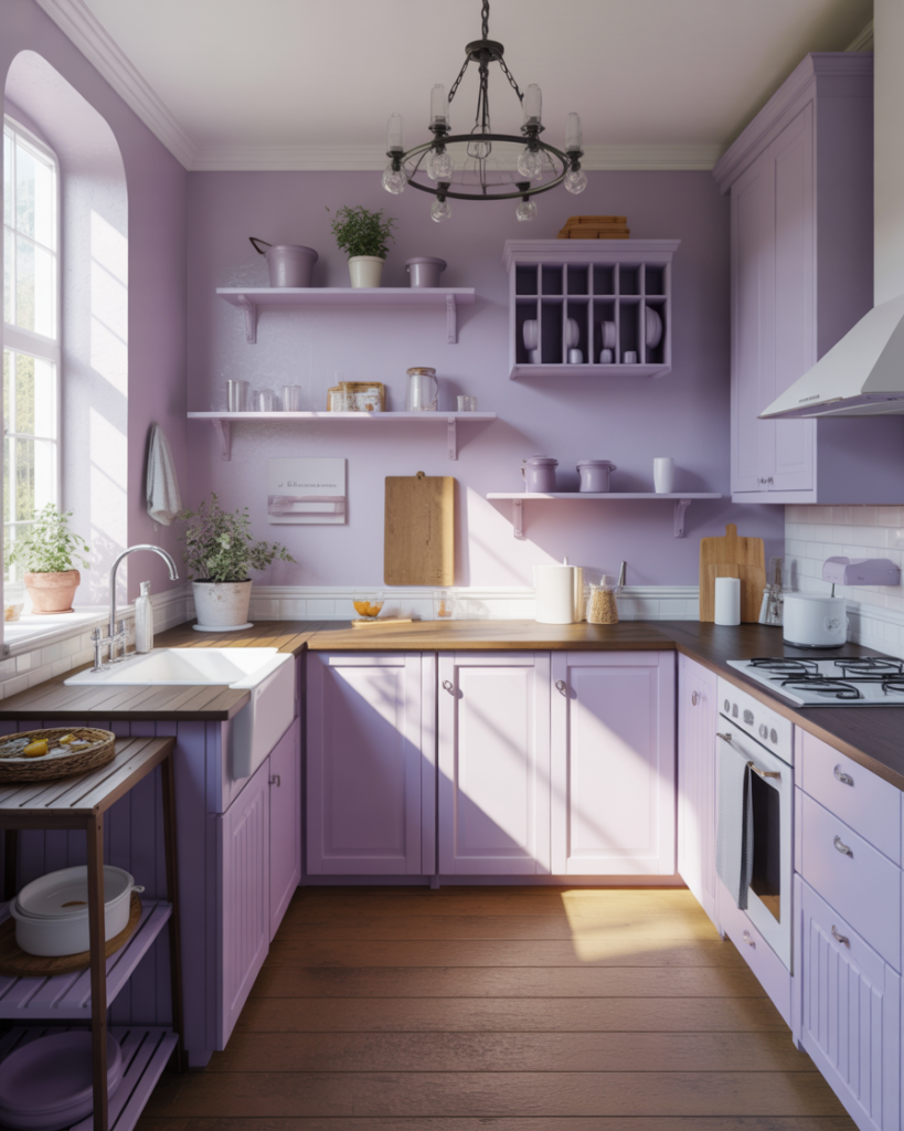 A soft lavender-gray adds unexpected elegance while staying within the neutral family. It works beautifully with white cabinets or oak cabinets, especially in modern or cottage kitchens that need a subtle hint of color. This shade brings a quiet, calming effect for walls and complements natural stone. Decorators consider it one of 2026’s most refined color ideas for homeowners seeking uniqueness with restraint.