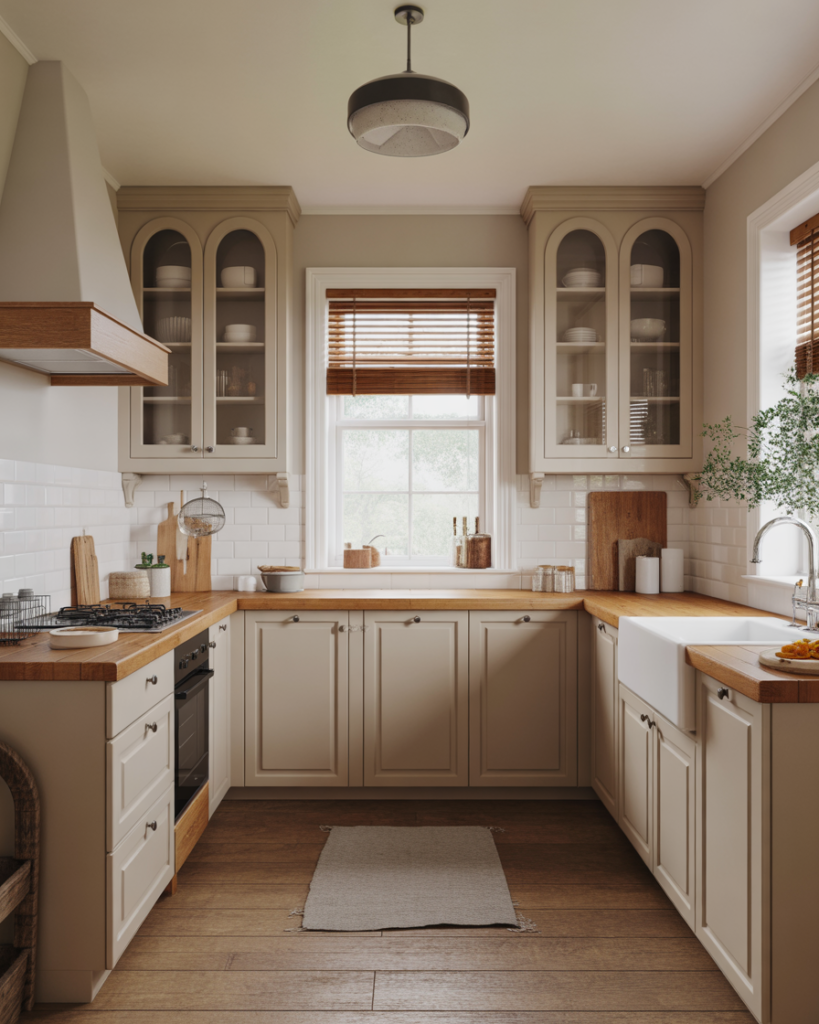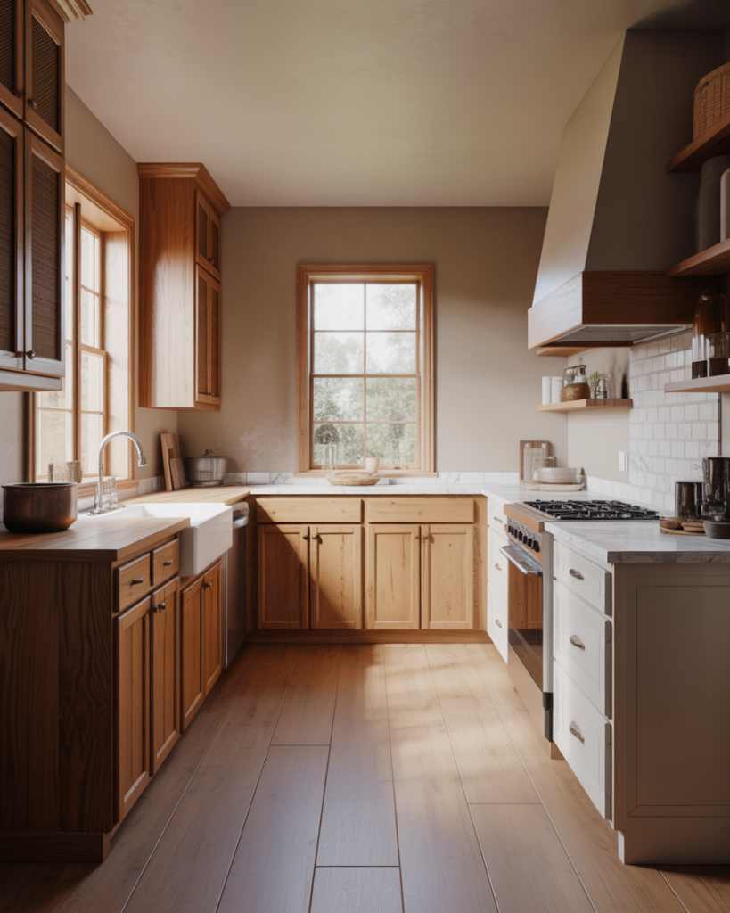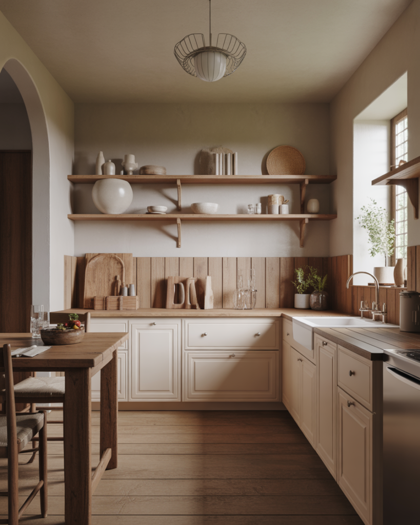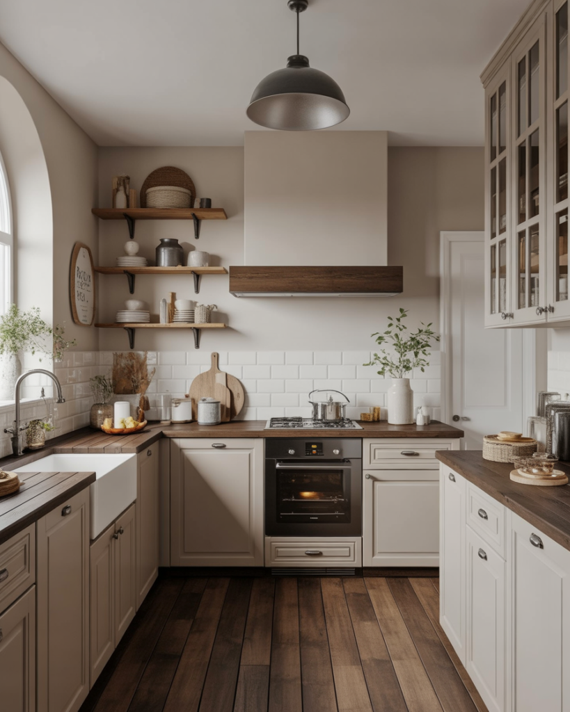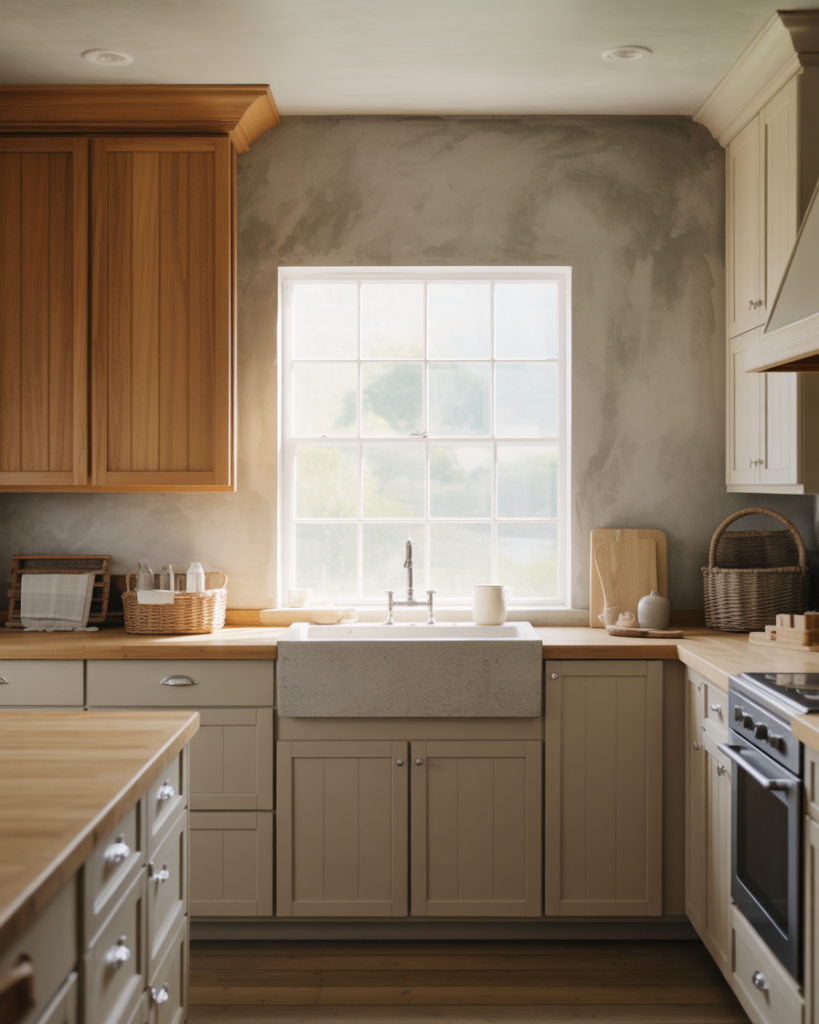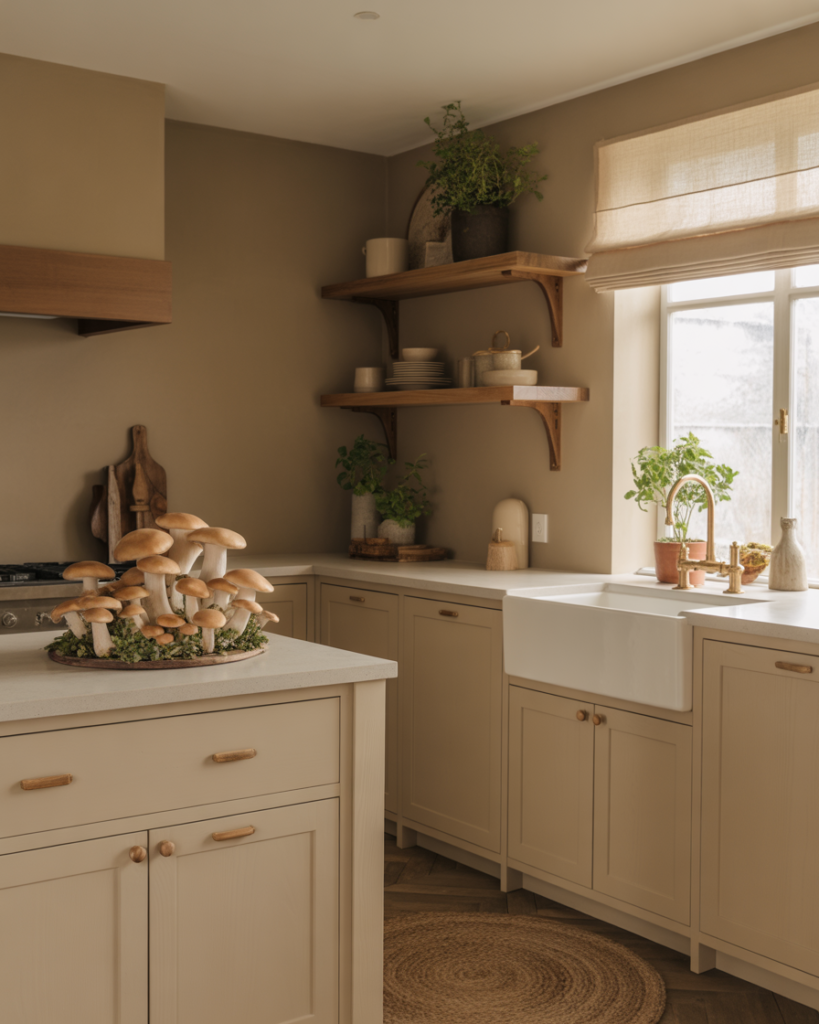 Mushroom beige blends gray and brown into an inviting neutral that complements oak cabinets, white cabinets, and dark wood. This color feels soft and approachable for walls, especially in rustic, cottage, or modern farmhouse settings. It’s becoming popular for 2026 because it supports layered textures and warm metals while staying understated enough for small or busy kitchens.