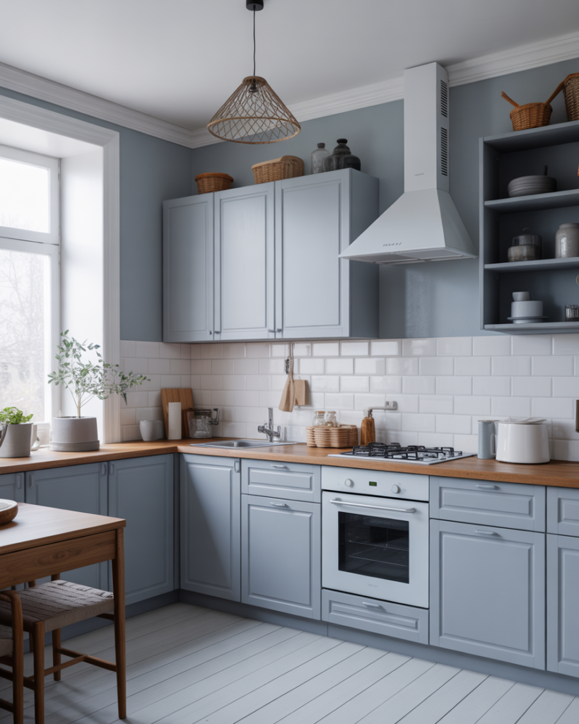 A gray-blue reminiscent of a cloudy day adds serenity for walls in modern and Scandinavian-inspired kitchens. It pairs effortlessly with white cabinets or pale wood cabinets, offering a clean but comforting mood that works well in open layouts shared with the living room. Homeowners wanting subtle color without boldness often choose this shade, making it a strong 2026 trend.