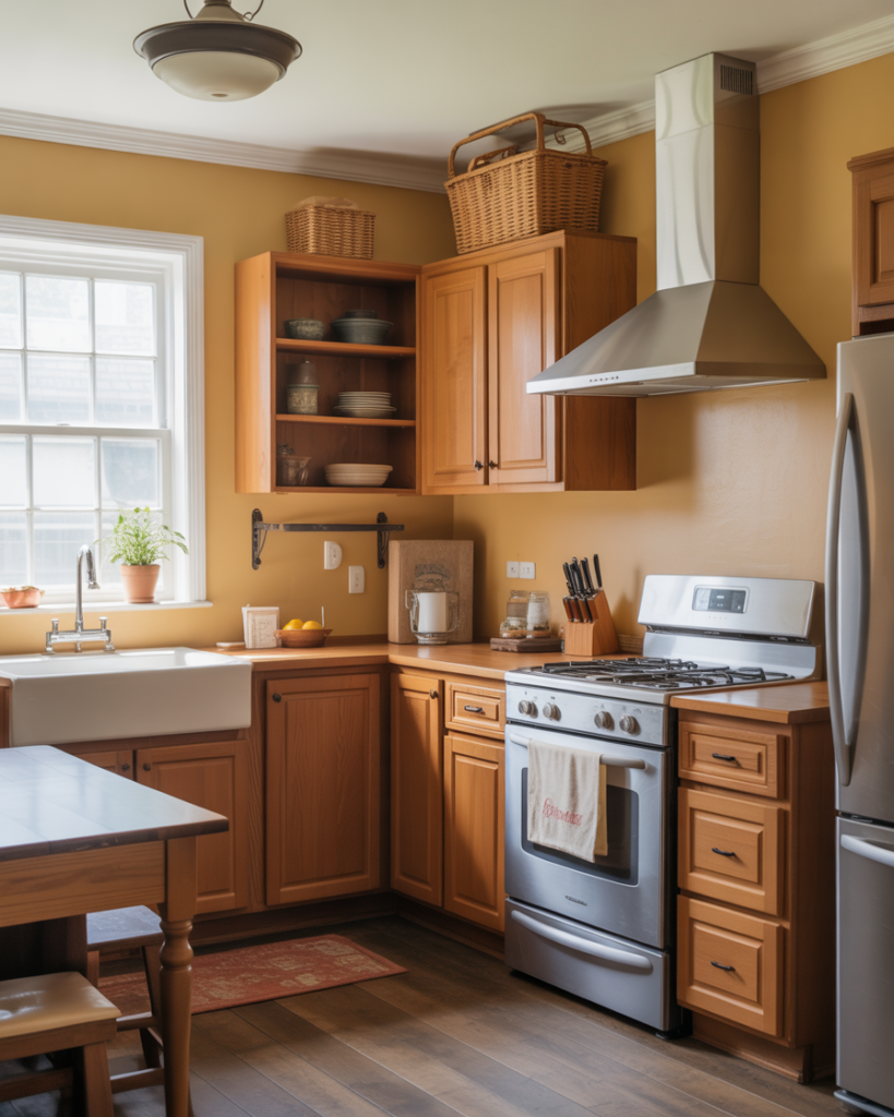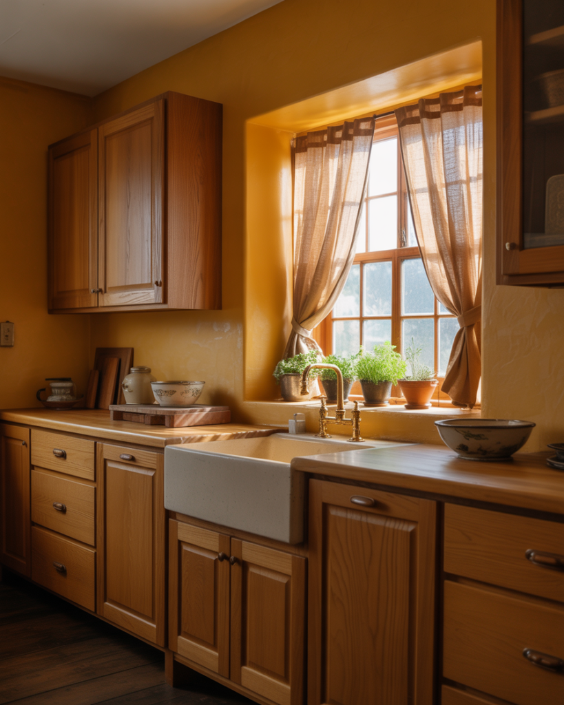 Warm clay tones create an inviting, earthy feel that works beautifully with wood cabinets and adds depth to walls without overwhelming the space. This shade fits both rustic and modern farmhouse settings, especially for kitchens with oak cabinets. Many decorators call it one of the best ideas for bringing natural balance into busy homes as people move away from cool grays toward comforting warmth.