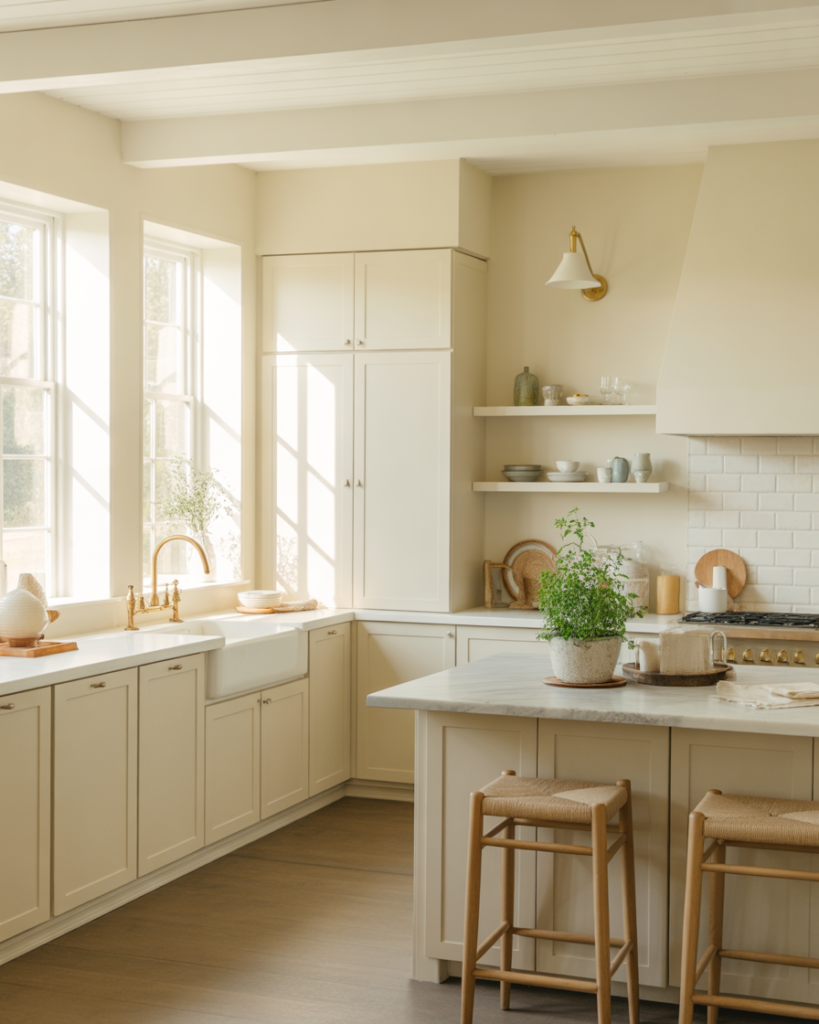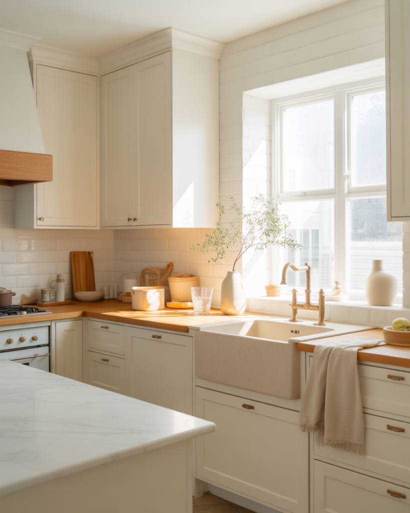 A layered white palette remains timeless and works effortlessly with white cabinets, brightening kitchens that lack natural light. Brands like Benjamin Moore and Sherwin Williams are spotlighting nuanced whites for 2026, offering gentle warmth without losing freshness. These tones are ideal for walls in modern or cottage kitchens and remain among the most popular color ideas for homeowners wanting simplicity that still feels personal.