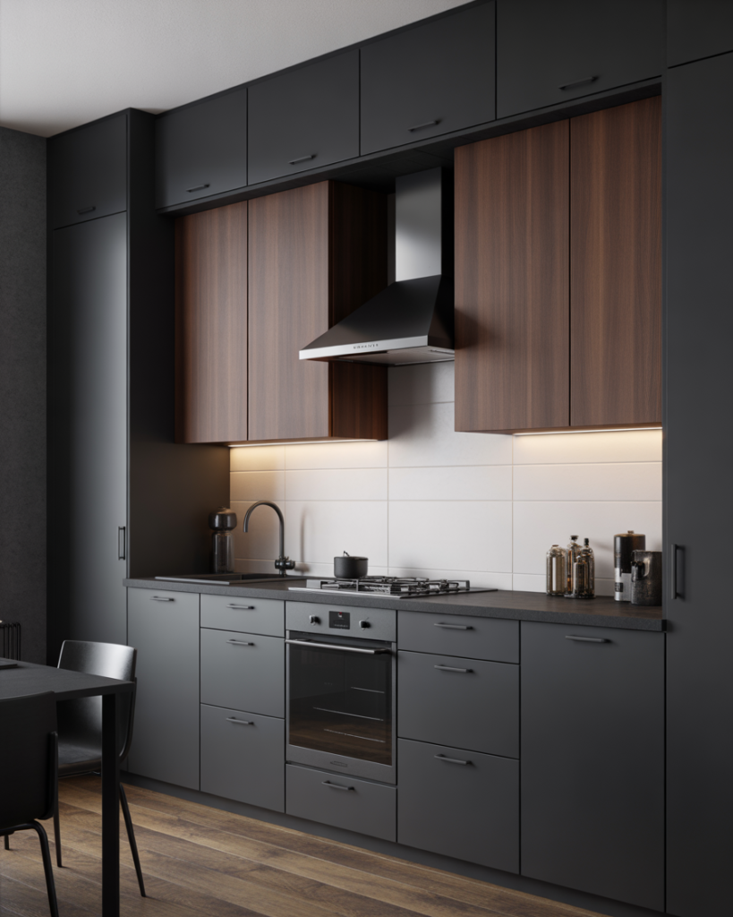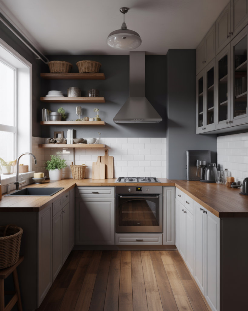 Charcoal gray gives kitchens a polished and quietly dramatic foundation. It works well with wood cabinets, white cabinets, or even cherry finishes and complements open-concept spaces connected to the living room. Decor writers highlight warm charcoal as one of the most popular 2026 colors due to its depth and versatility in modern homes. It also pairs effortlessly with mixed metals and layered textures.
