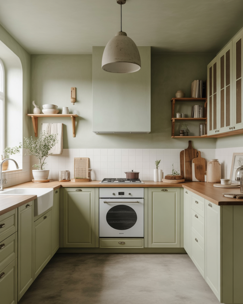 Soft sage green offers calmness that blends seamlessly with oak cabinets or brings contrast with white cabinets. This gentle hue works well in farmhouse, earthy, and modern kitchens and is predicted to become one of the standout ideas for walls in 2026. Sage also pairs beautifully with trending green cabinets, giving homeowners a soothing palette rooted in natural comfort without feeling too bold.