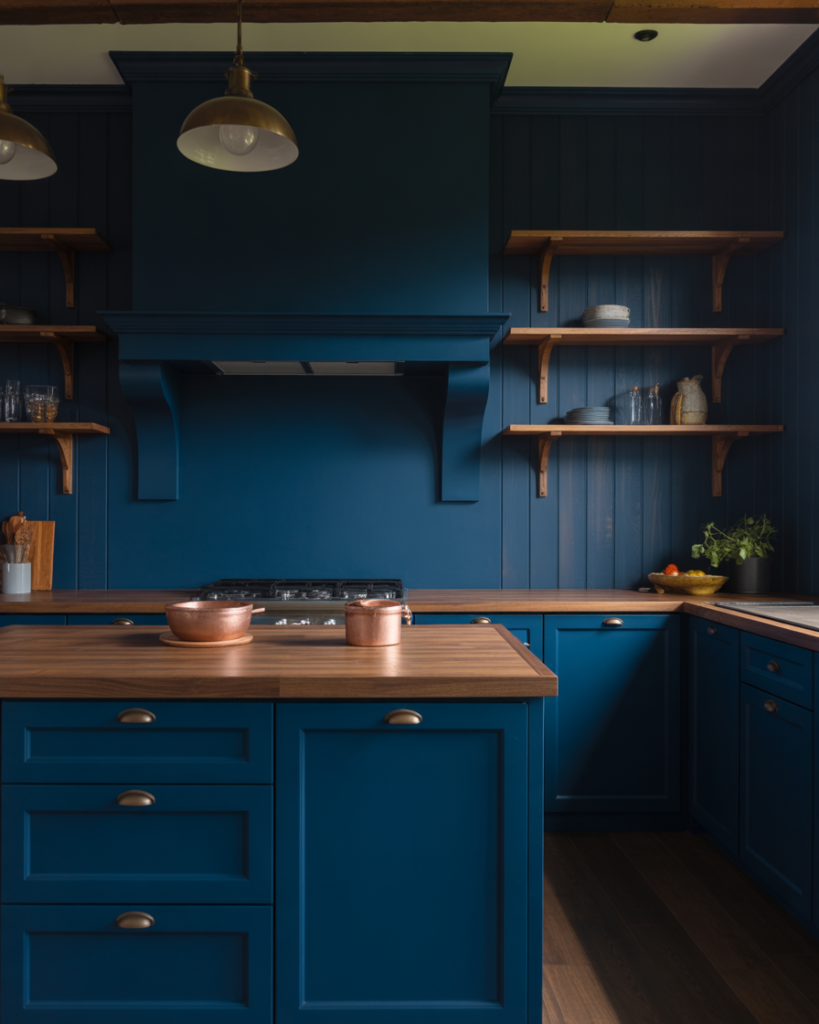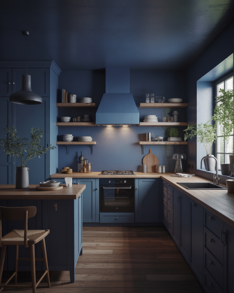 A deep, moody midnight blue brings instant sophistication, especially in kitchens featuring dark wood or mixed finishes. It adds drama for walls or lower cabinets and suits modern, rustic, or transitional styles. Many designers highlight this shade for 2026 because it delivers personality without sacrificing comfort. When paired with wood cabinets, it creates a refined, grounded look that feels both current and timeless.
