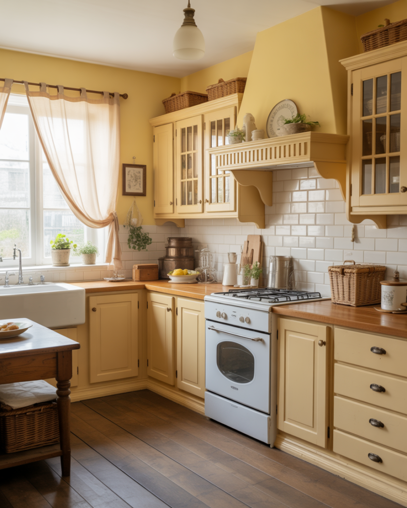 A creamy pastel yellow brings cheerful charm often associated with cottage and farmhouse kitchens. It feels optimistic without overwhelming the space and pairs beautifully with oak cabinets or vintage-inspired cabinets. This sunny tone suits smaller kitchens needing warmth on the wall, and it aligns with the popular shift toward more emotional, human-centered colors for 2026. It’s a bright yet gentle option for homeowners who love nostalgia.