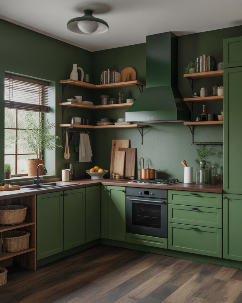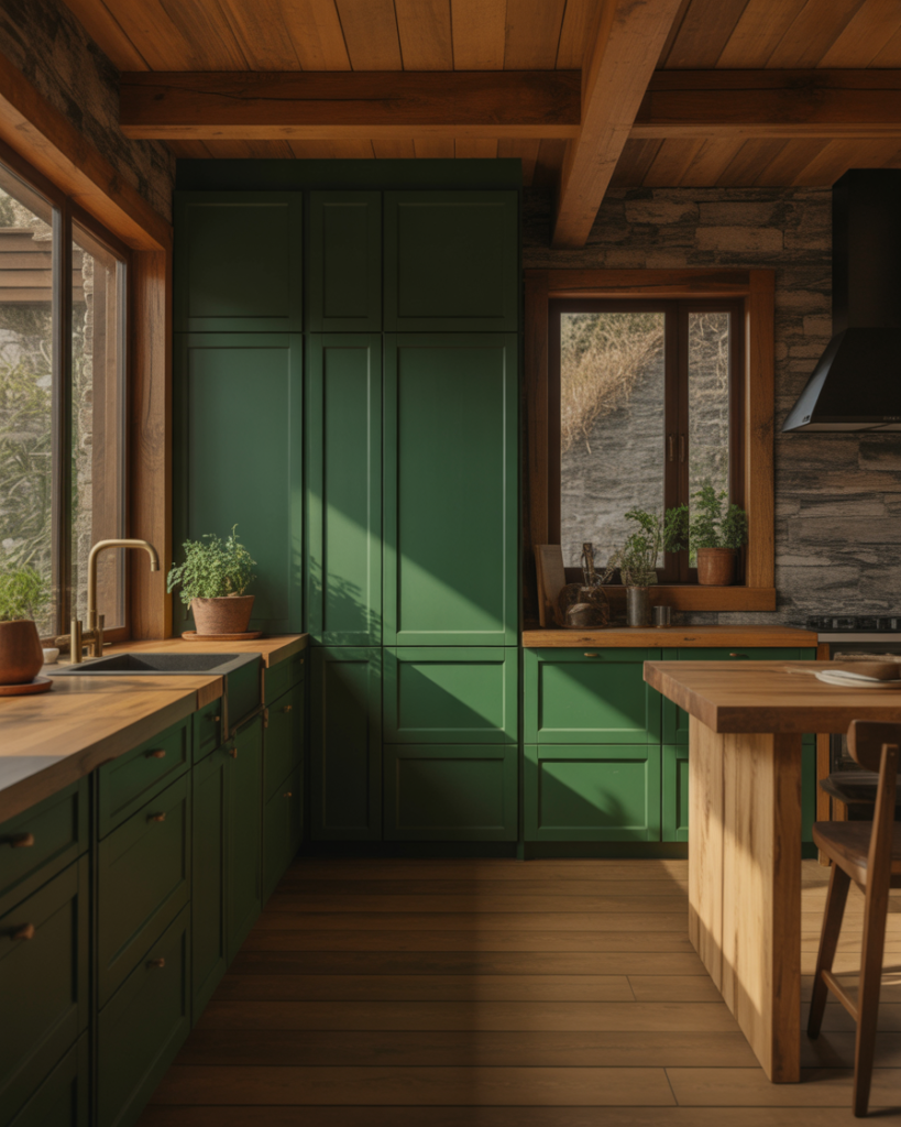 Forest green cabinets or deep green walls continue to gain traction as homeowners lean into bold, earthy looks. This shade complements dark wood, rustic styling, and upscale modern kitchens. Designers like Jean Stoffer frequently use forest green to create visual depth, especially with wood cabinets for a grounded, organic appearance. It’s expected to remain one of the defining colors of 2026.