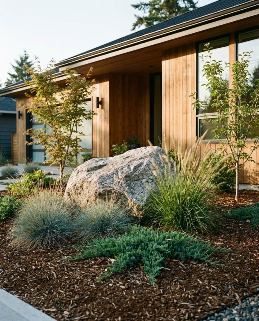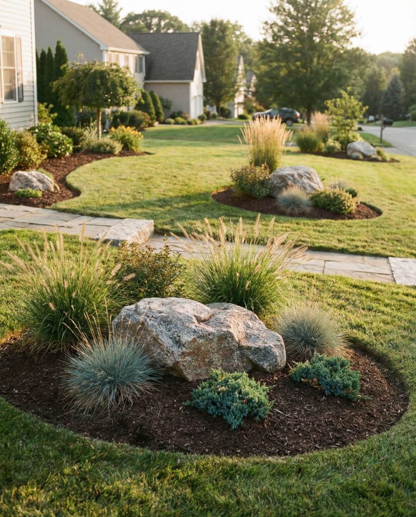 Creating rock “islands” in the Front yard breaks up large lawn areas and adds visual rhythm. Instead of endless grass, designers cluster large rocks with low plants and mulch, giving the Front of the House more depth. I’ve noticed this approach reduces watering needs while making the Front house feel more intentional. These islands work well on a slope, where mowing is difficult, and they transition naturally into surrounding Grasses. The result feels thoughtful rather than decorative, offering structure without overwhelming the home.